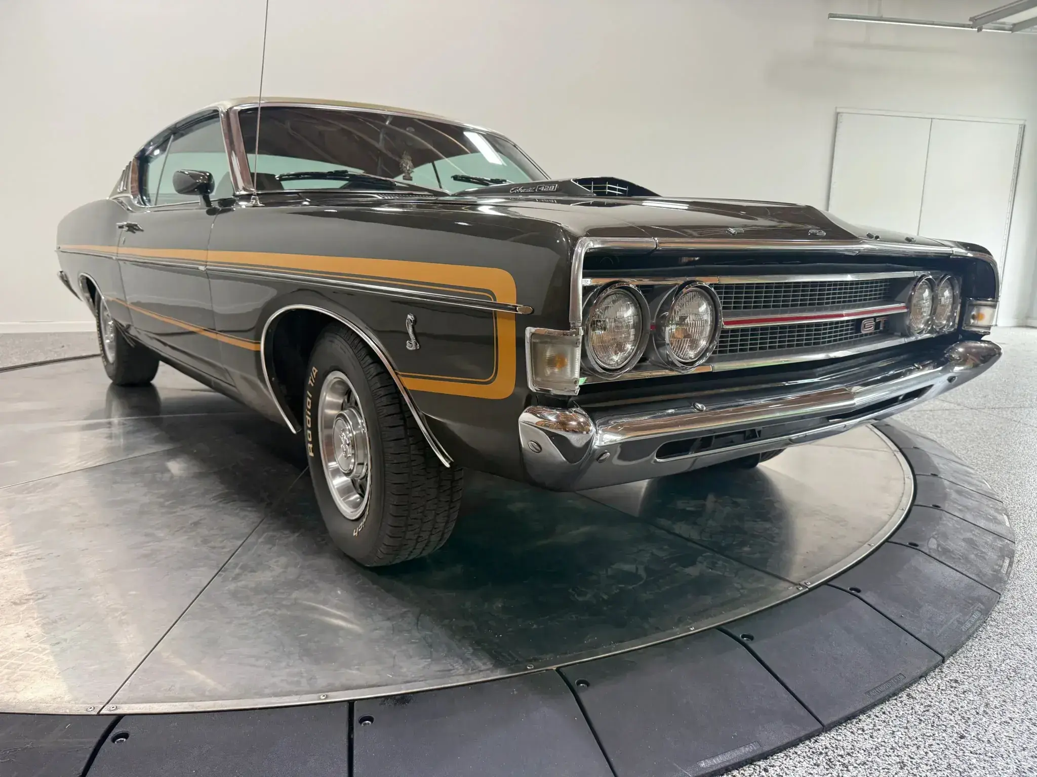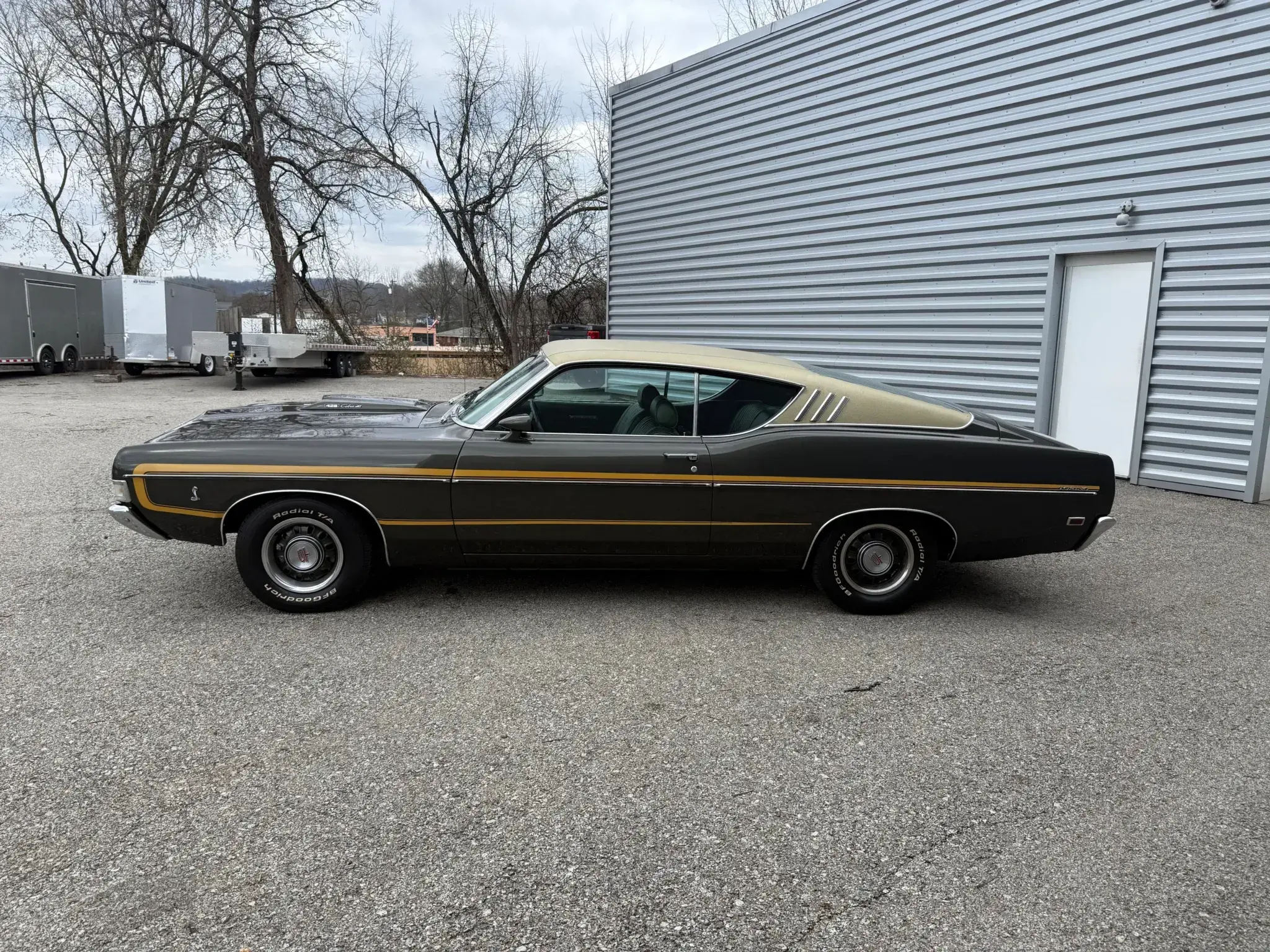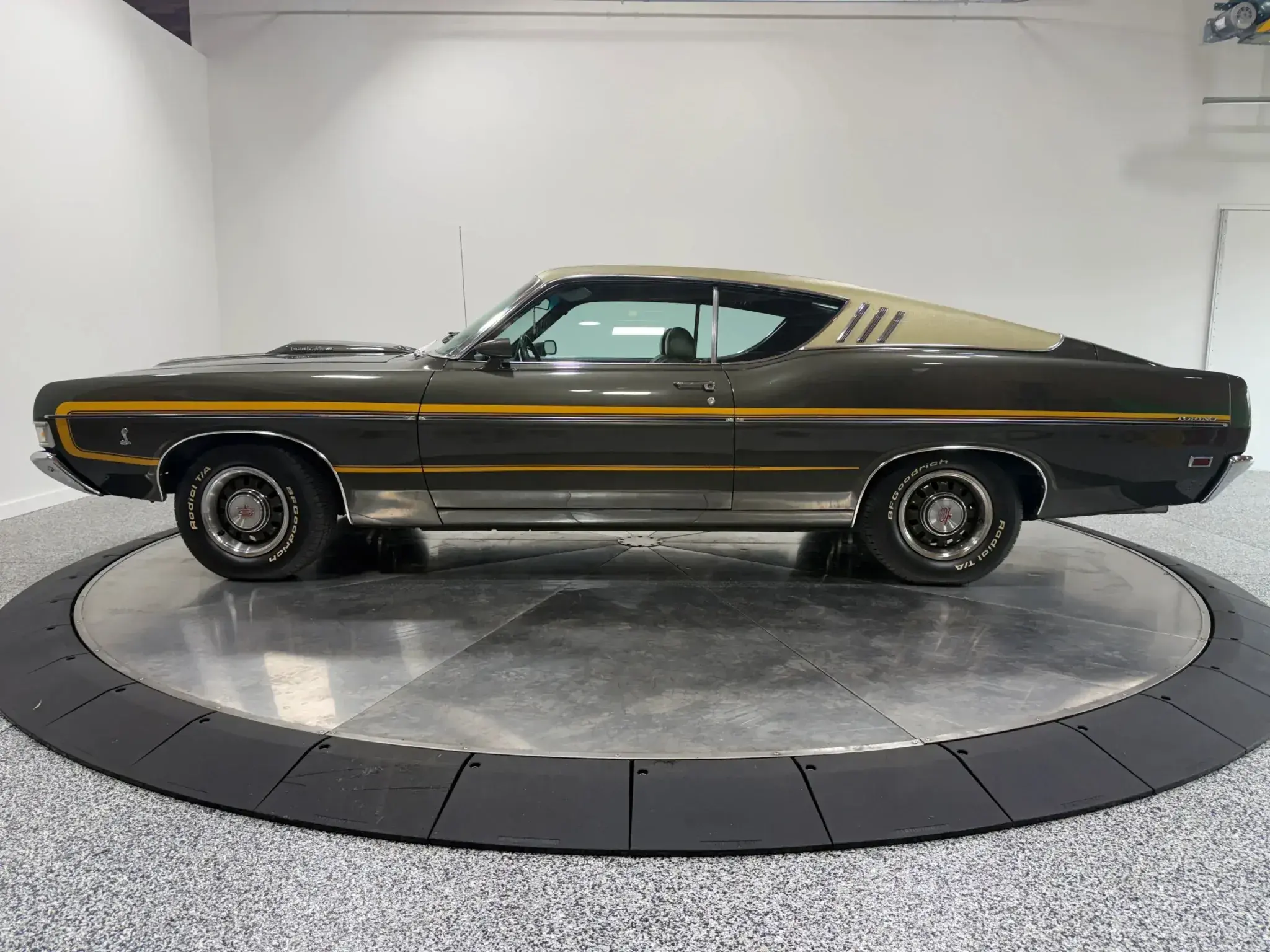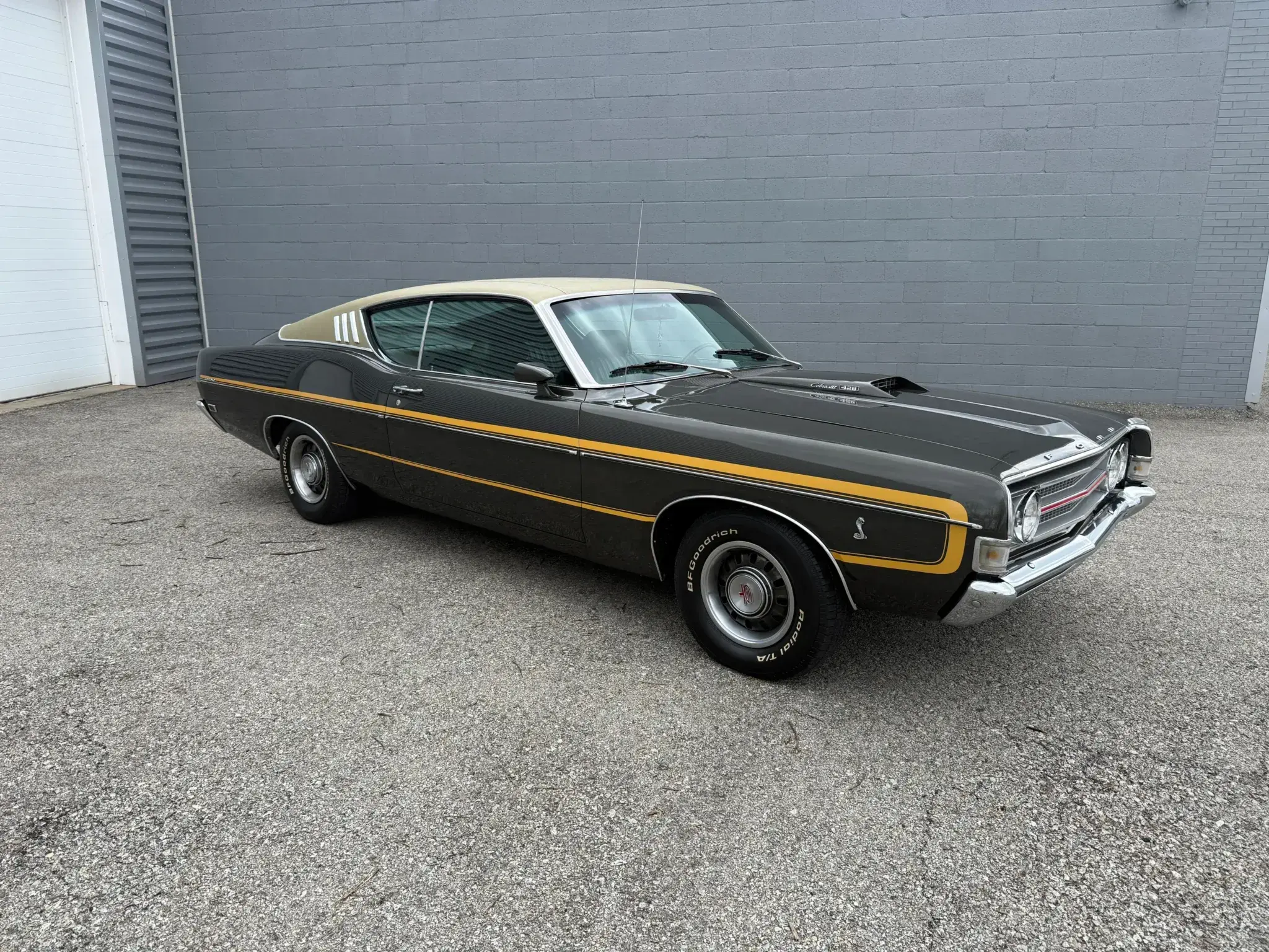Max Motive is proud to present this 1969 Cobra Jet Torino. Finished in Jade black paint with gold stripes and a matching vinyl hard top this car cuts quite an appearance! Powered by the 428 R Code Ram air V8 engine, the build also features a Holley 600 CFM carburetor, aluminum intake, and a Ford C6 automatic transmission that delivers power to a 9-inch Posi read end.This classic muscle car is rounded out with 14-inch OEM wheels with Torino GT hubcaps wrapped in BFGoodrich Radial tires. The interior sports a unique green vinyl finish that is in great condition. Authenticated by an included Marti Report, this high performance classic is also equipped with power front disc brakes delivering confident stopping power whenever it is needed. This car is a time capsule to the American muscle car era ready for its next home!