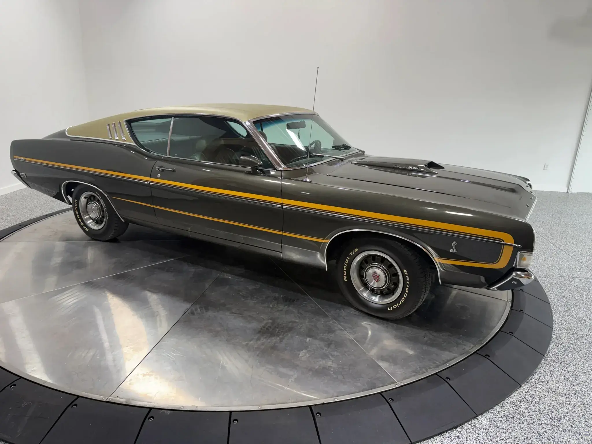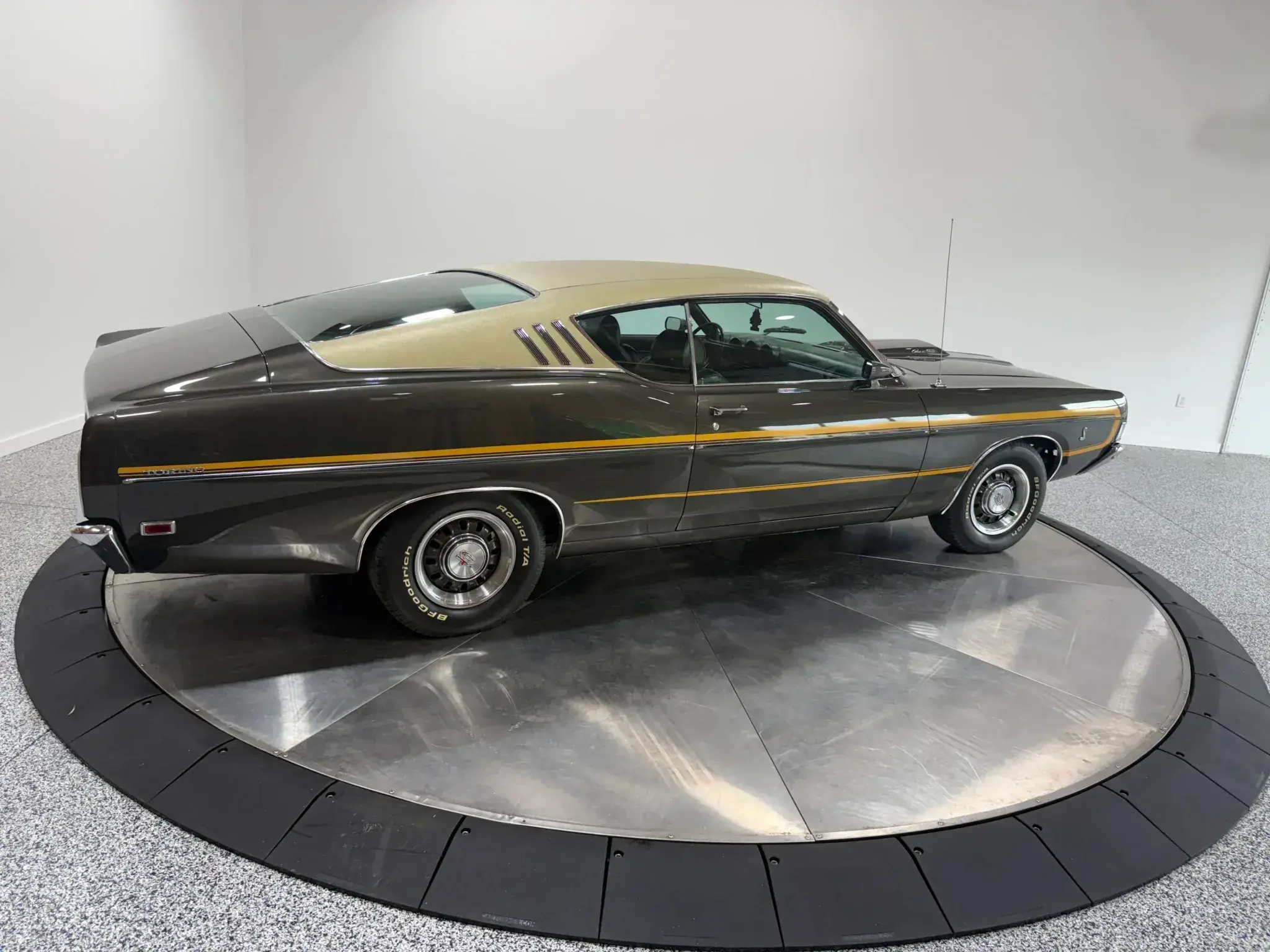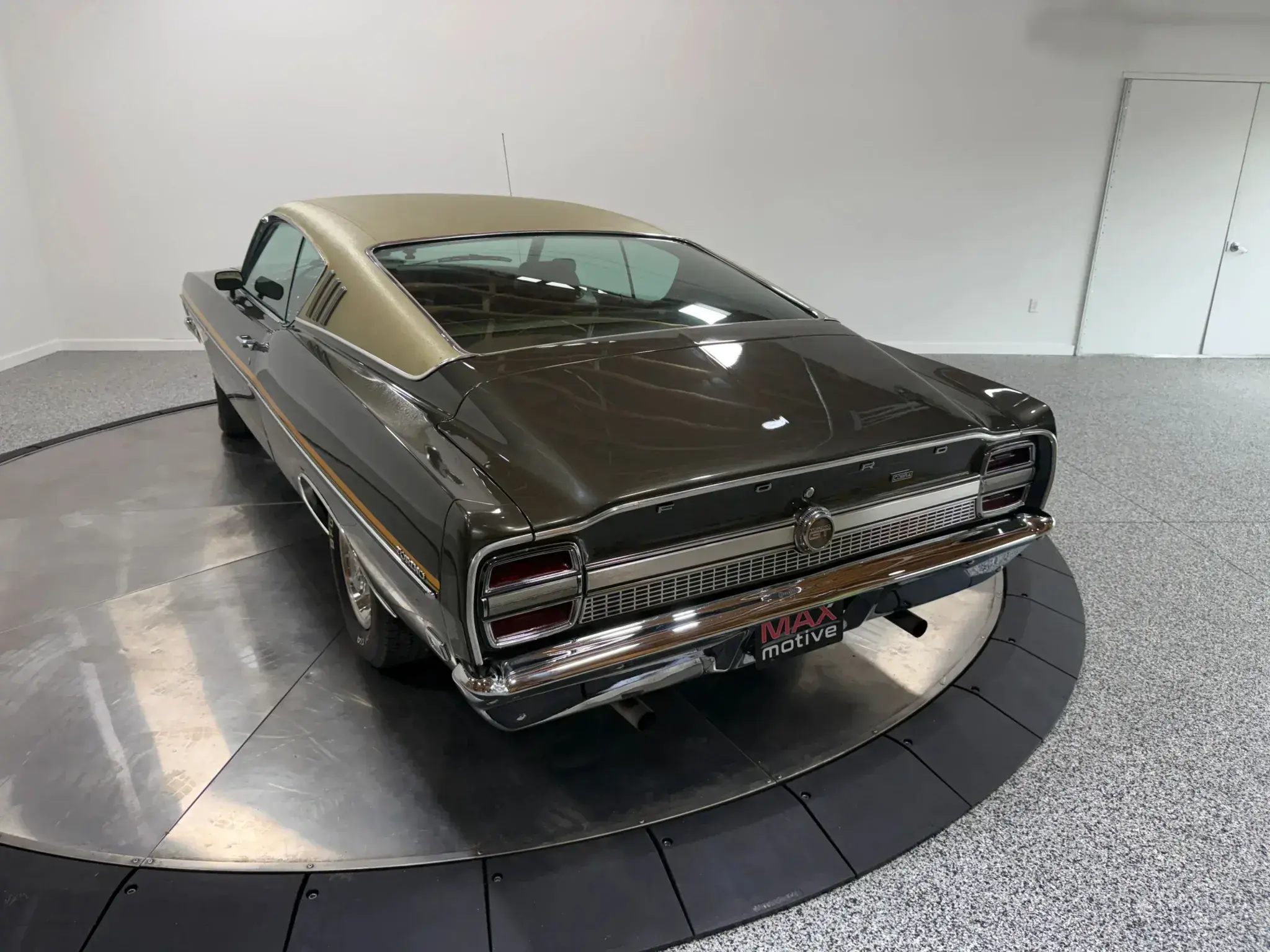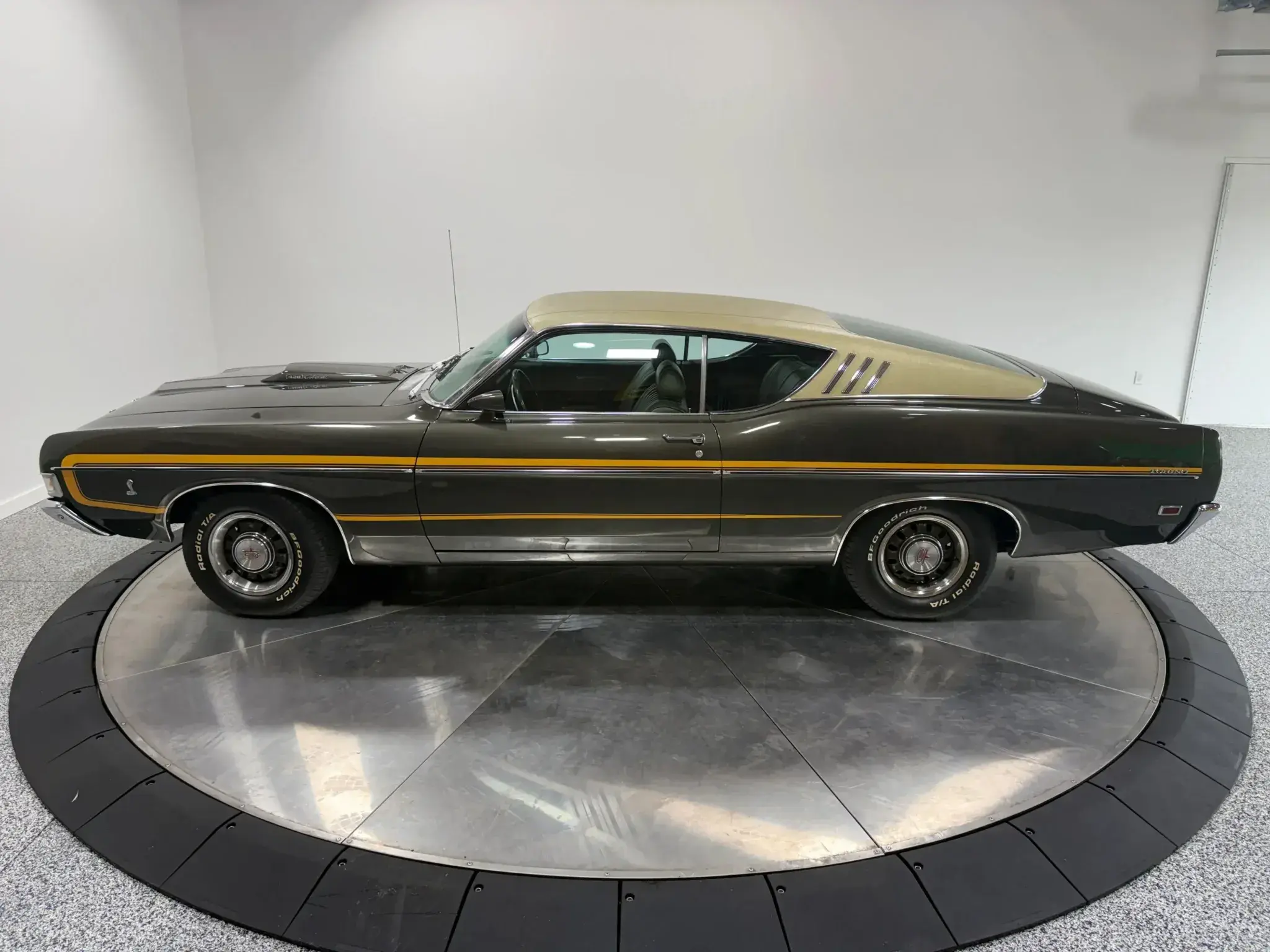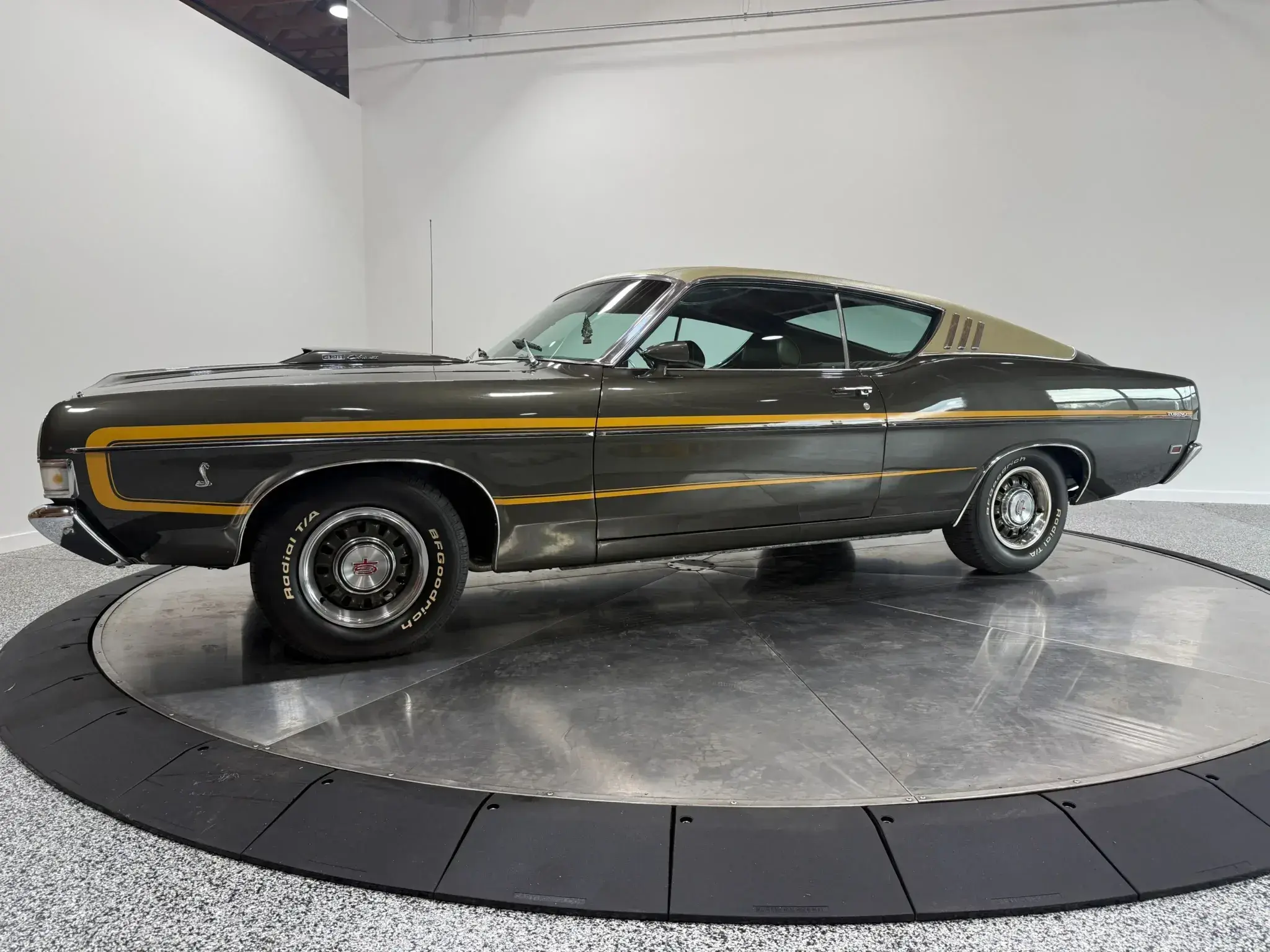 Max Motive is proud to present this 1969 Cobra Jet Torino. Finished in Jade black paint with gold stripes and a matching vinyl hard top this car cuts quite an appearance! Powered by the 428 R Code Ram air V8 engine, the build also features a Holley 600 CFM carburetor, aluminum intake, and a Ford C6 automatic transmission that delivers power to a 9-inch Posi read end.This classic muscle car is rounded out with 14-inch OEM wheels with Torino GT hubcaps wrapped in BFGoodrich Radial tires. The interior sports a unique green vinyl finish that is in great condition. Authenticated by an included Marti Report, this high performance classic is also equipped with power front disc brakes delivering confident stopping power whenever it is needed. This car is a time capsule to the American muscle car era ready for its next home!