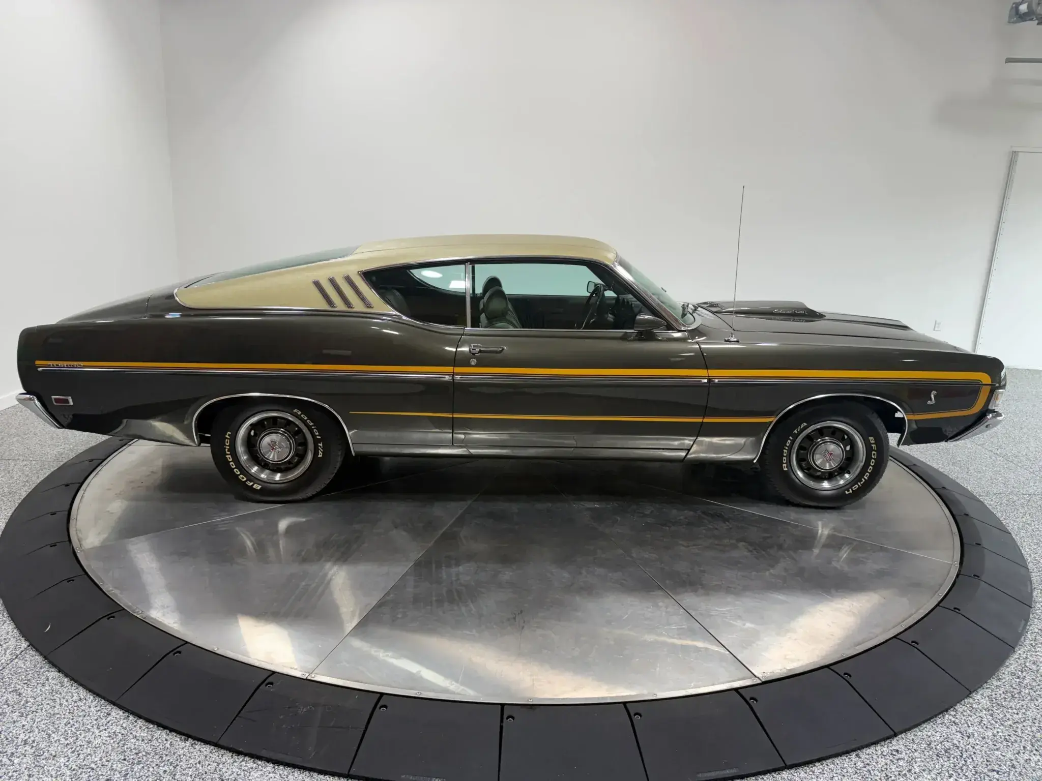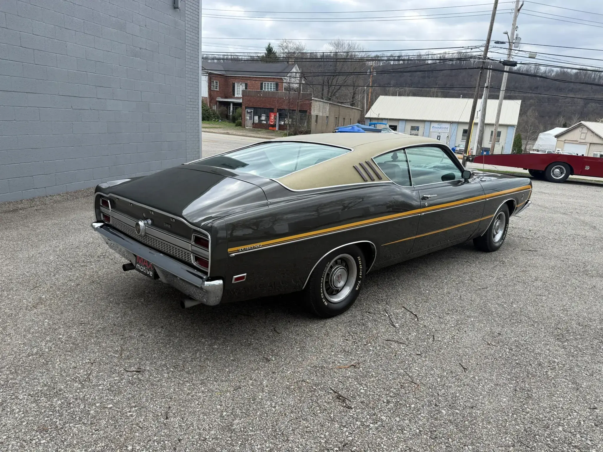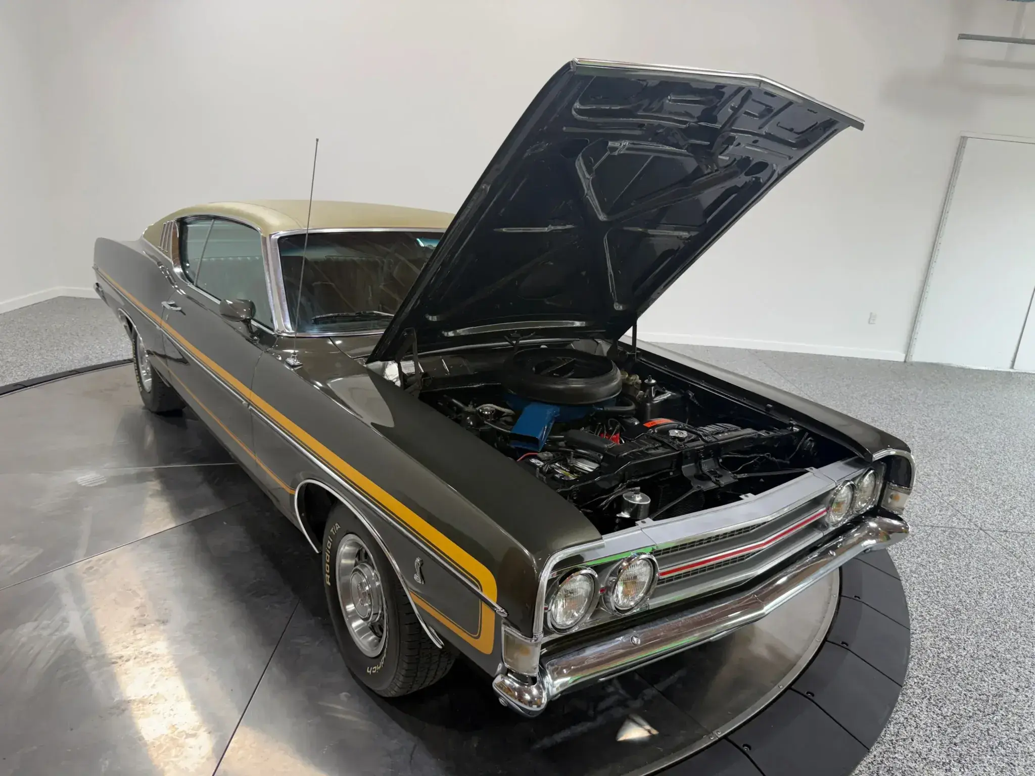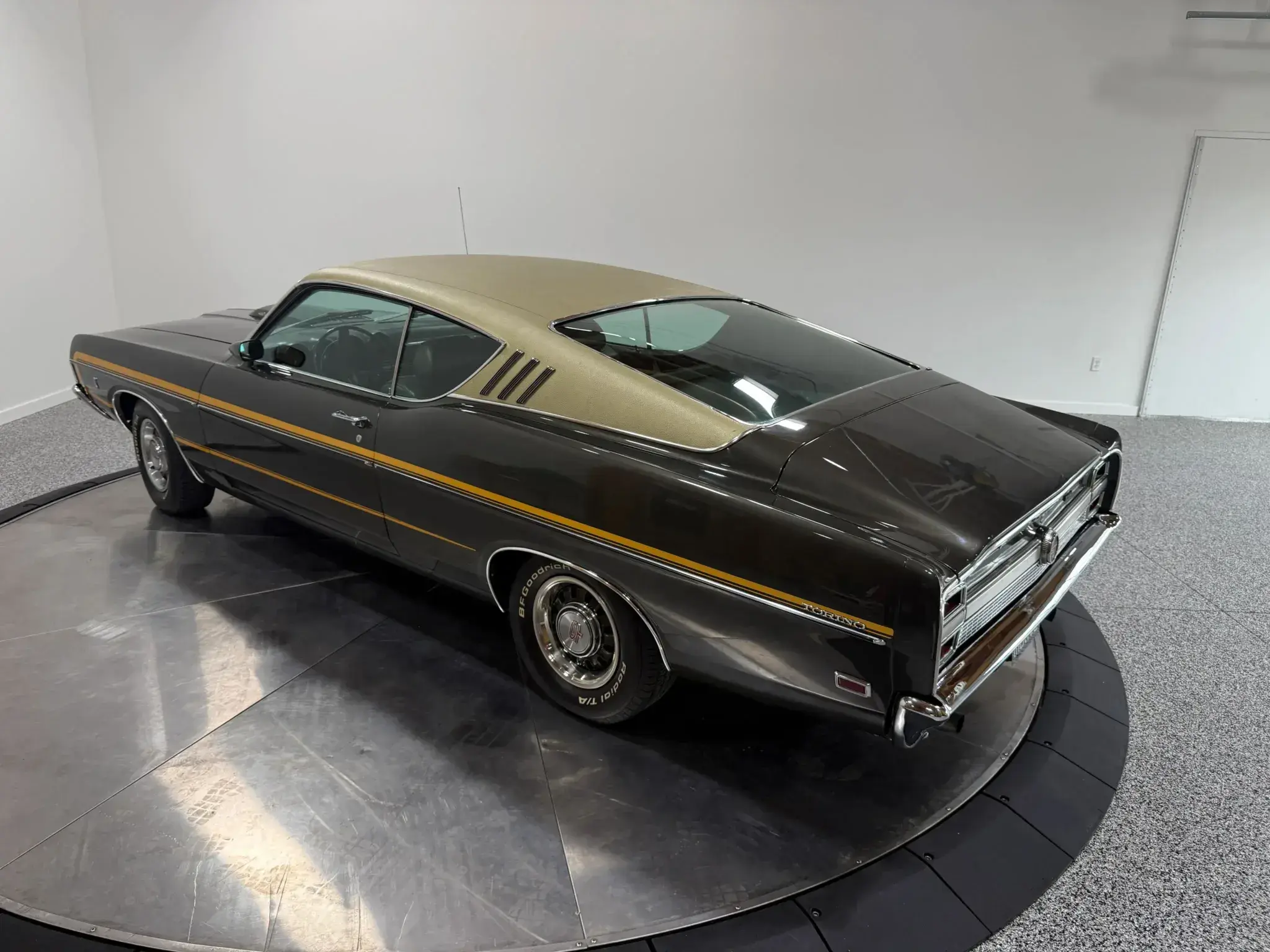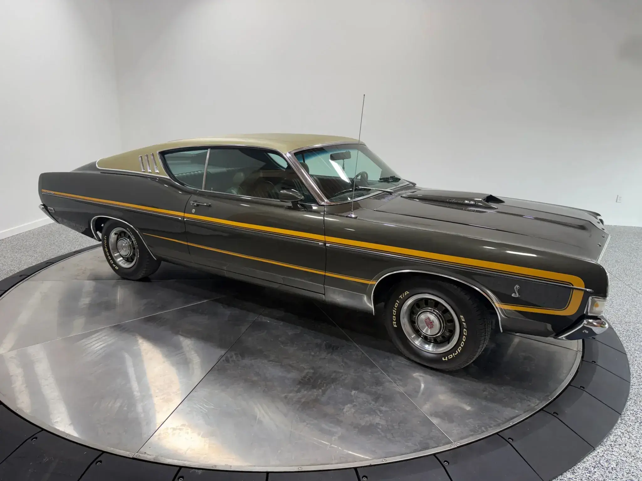 Max Motive is proud to present this 1969 Cobra Jet Torino. Finished in Jade black paint with gold stripes and a matching vinyl hard top this car cuts quite an appearance! Powered by the 428 R Code Ram air V8 engine, the build also features a Holley 600 CFM carburetor, aluminum intake, and a Ford C6 automatic transmission that delivers power to a 9-inch Posi read end.This classic muscle car is rounded out with 14-inch OEM wheels with Torino GT hubcaps wrapped in BFGoodrich Radial tires. The interior sports a unique green vinyl finish that is in great condition. Authenticated by an included Marti Report, this high performance classic is also equipped with power front disc brakes delivering confident stopping power whenever it is needed. This car is a time capsule to the American muscle car era ready for its next home!