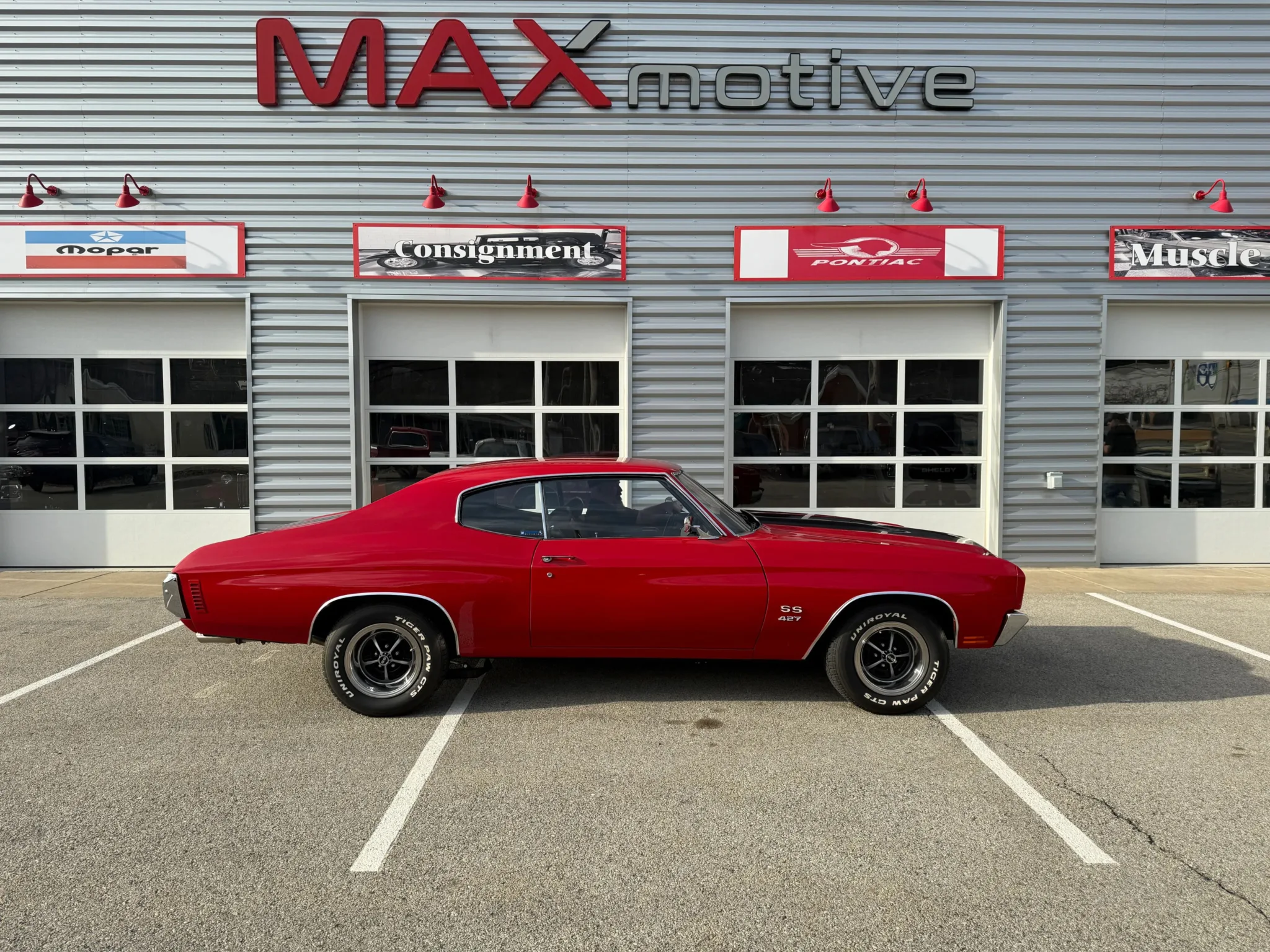 Maxmotive is proud to present this 1970 Chevrolet Chevelle SS Tribute, a high-performance muscle car finished in classic Red with iconic Black stripes on the hood and trunk. Built for the street and the strip, it features a 454 CI Big Block engine paired with a Turbo 400 automatic transmission with a performance valve body and a B&M Shifter. The drivetrain is engineered for maximum traction, utilizing a Ford 9-Inch rear end with a spool differential, pinion snubber bars, and 15 inch wheels wrapped in Uniroyal tires. Inside, the black vinyl interior is equipped with a 5-inch Summit tachometer with a shift light, tilt steering wheel, and eclipse speakers. This Chevelle includes documentation of the work done to the car as well.