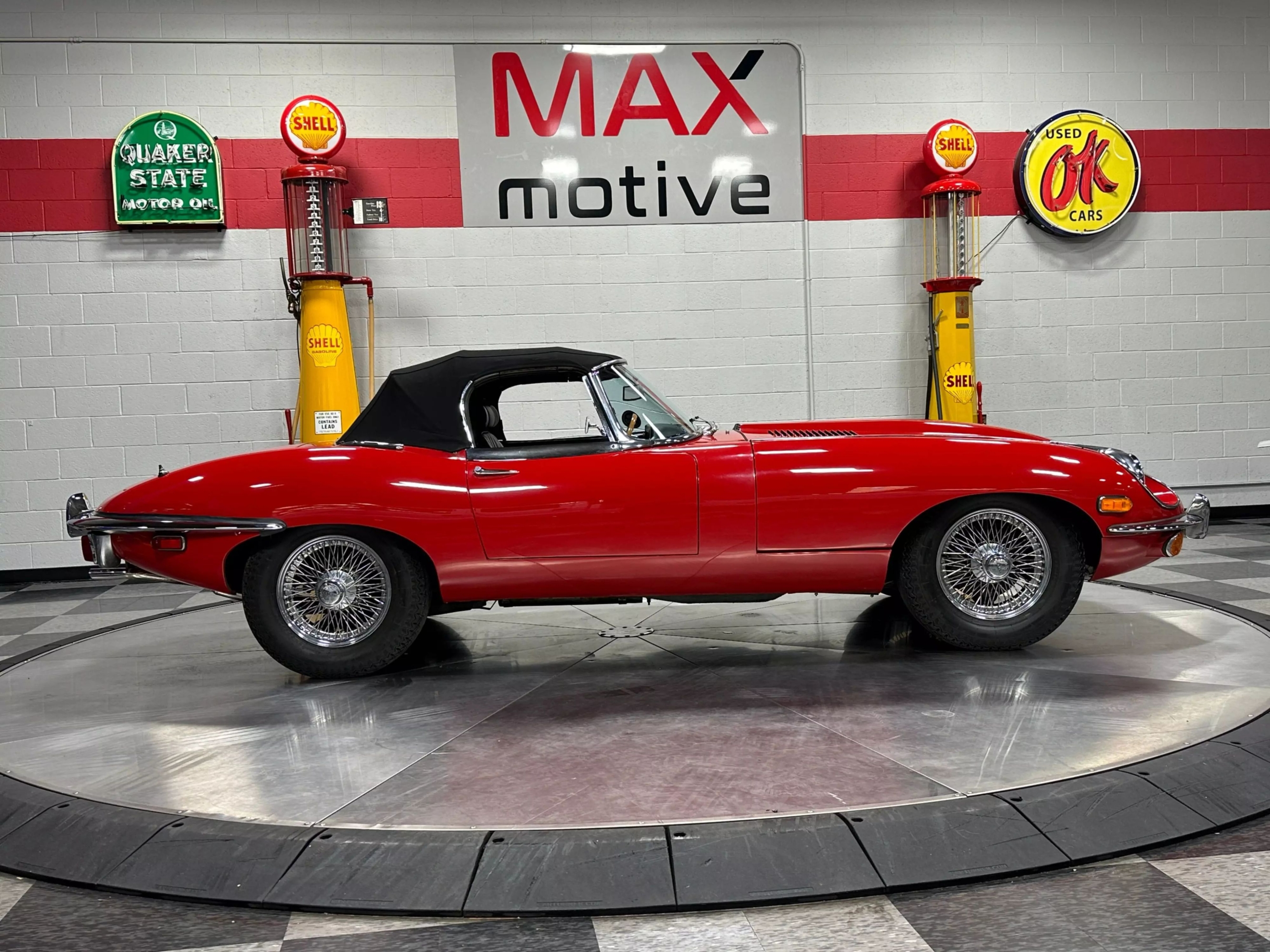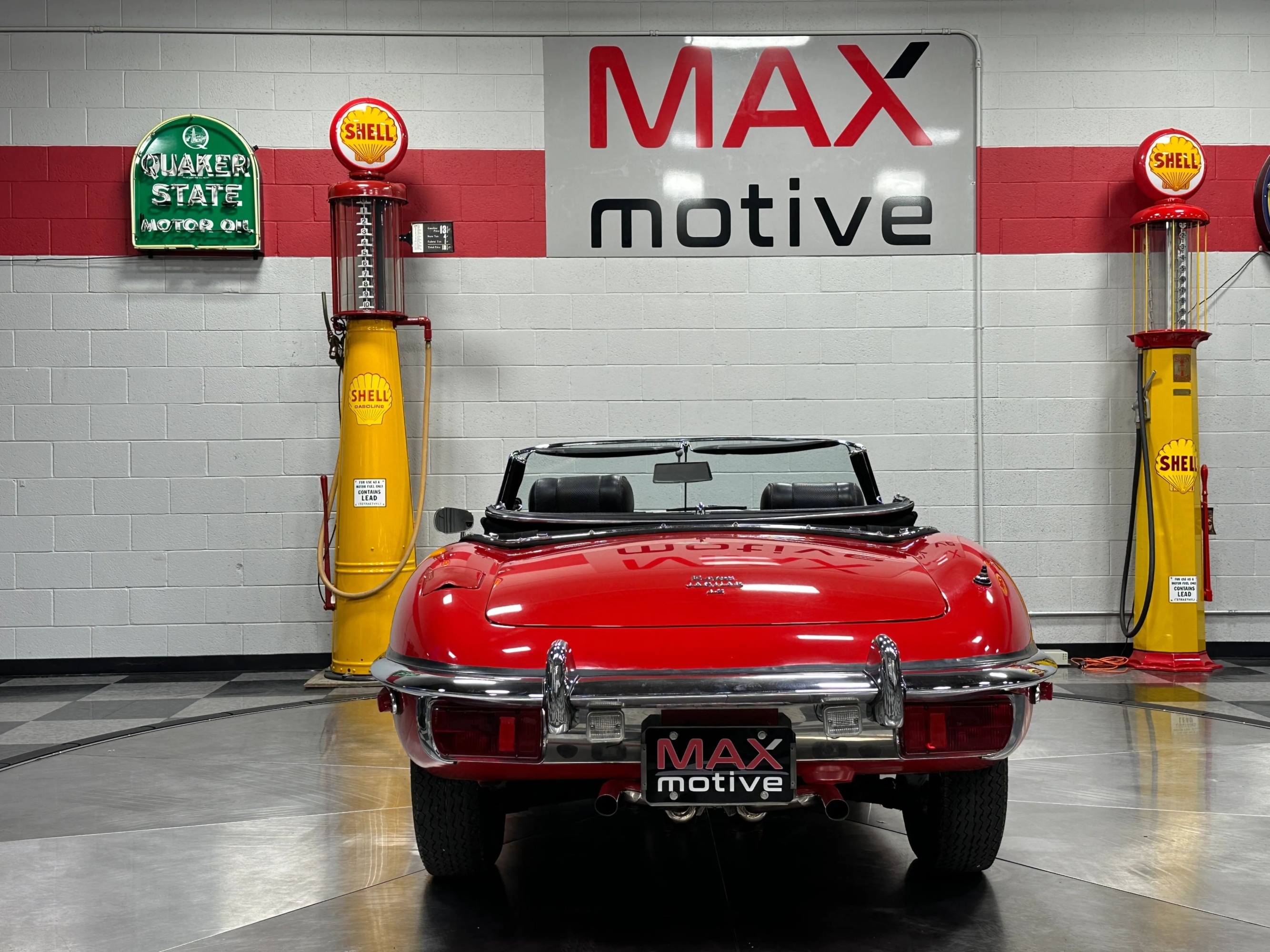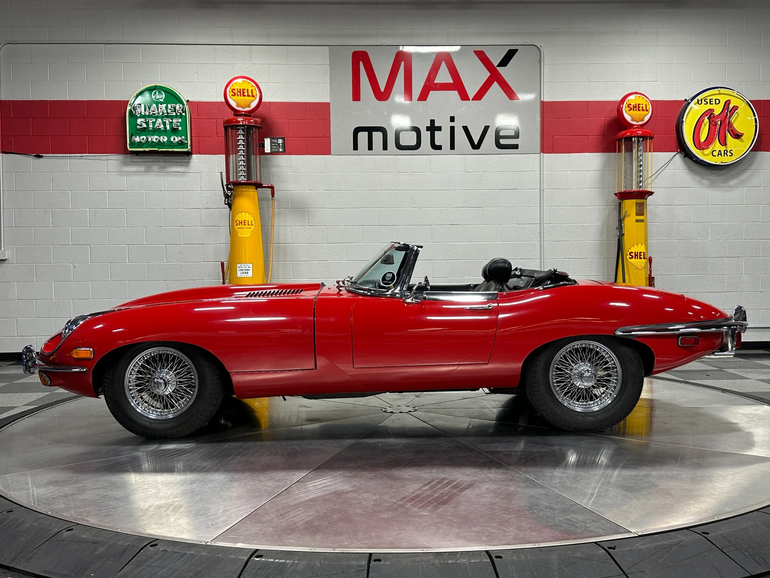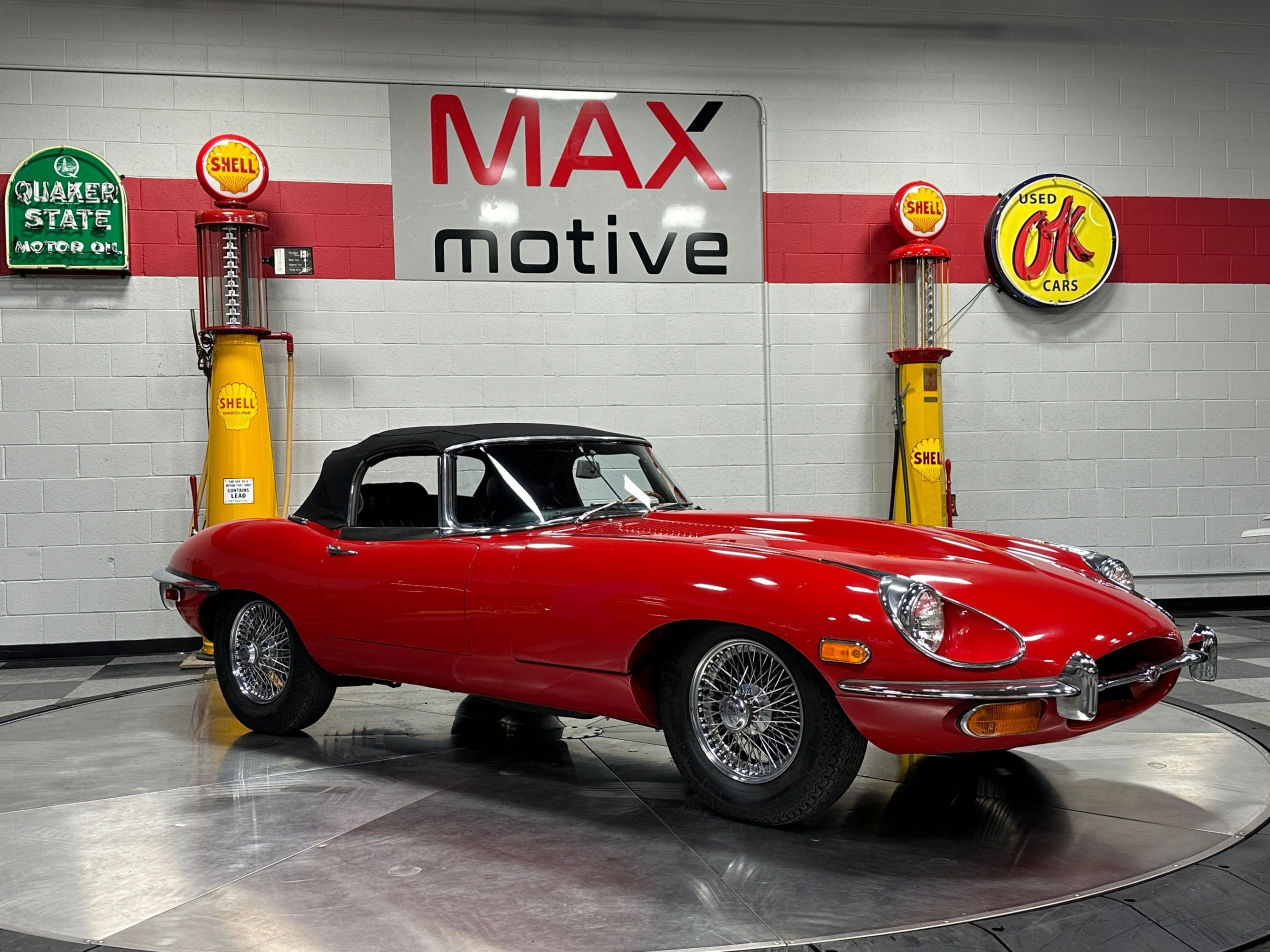 MaxMotive presents this handsome 1970 Jaguar E-Type Series II Convertible. It has been with the same family since 2004 and the odometer shows 32709 miles. The car was treated to a thorough restoration comprehensive photos included in which the color was changed to a vibrant Signal Red, contrasting nicely with the beautiful Jaguar chrome wire wheels mounting V-rated Dunlop SP Sport radial tires. Beneath the bonnet is the familiar 4.2L straight-line 6-cylinder engine with dual Stromberg carburetors. Its paired with the manually shifted 4-speed gearbox. It has a black soft top, while black upholstered leather seats provide comfort and support. A full complement of clearly legible gauges and a wood-rimmed steering wheel round out the interior. Other distinguishing features include the famous tilt front end and the well-engineered independent rear suspension with inboard disc brakes. Along with the car comes a thick binder with restoration photos, a tool kit, extra paint, and a car cover. This 1970 Jaguar E-Type Series II Convertible is complete and available for your collection. Please be sure to see the detailed photos at www.maxmotive.com.