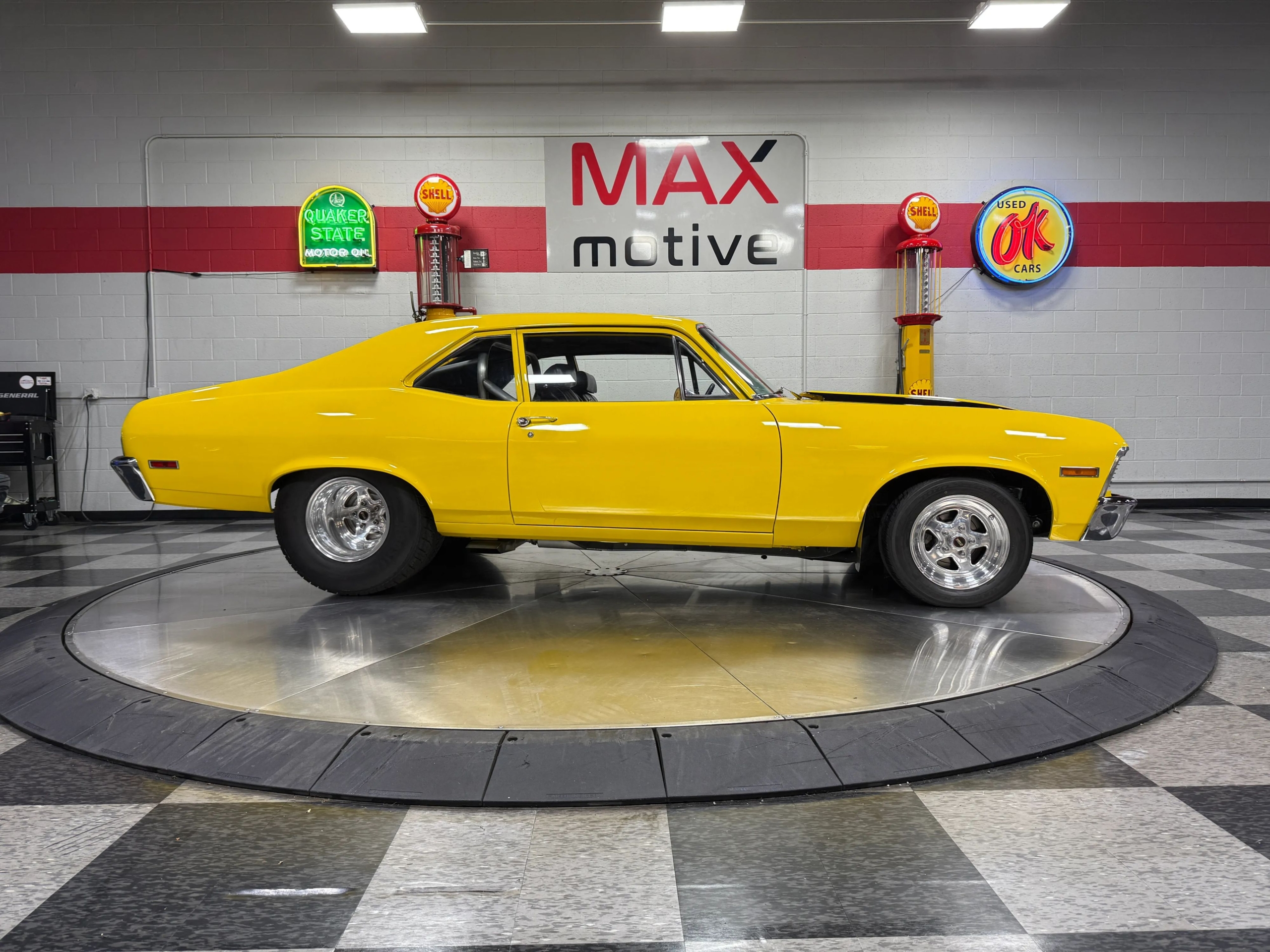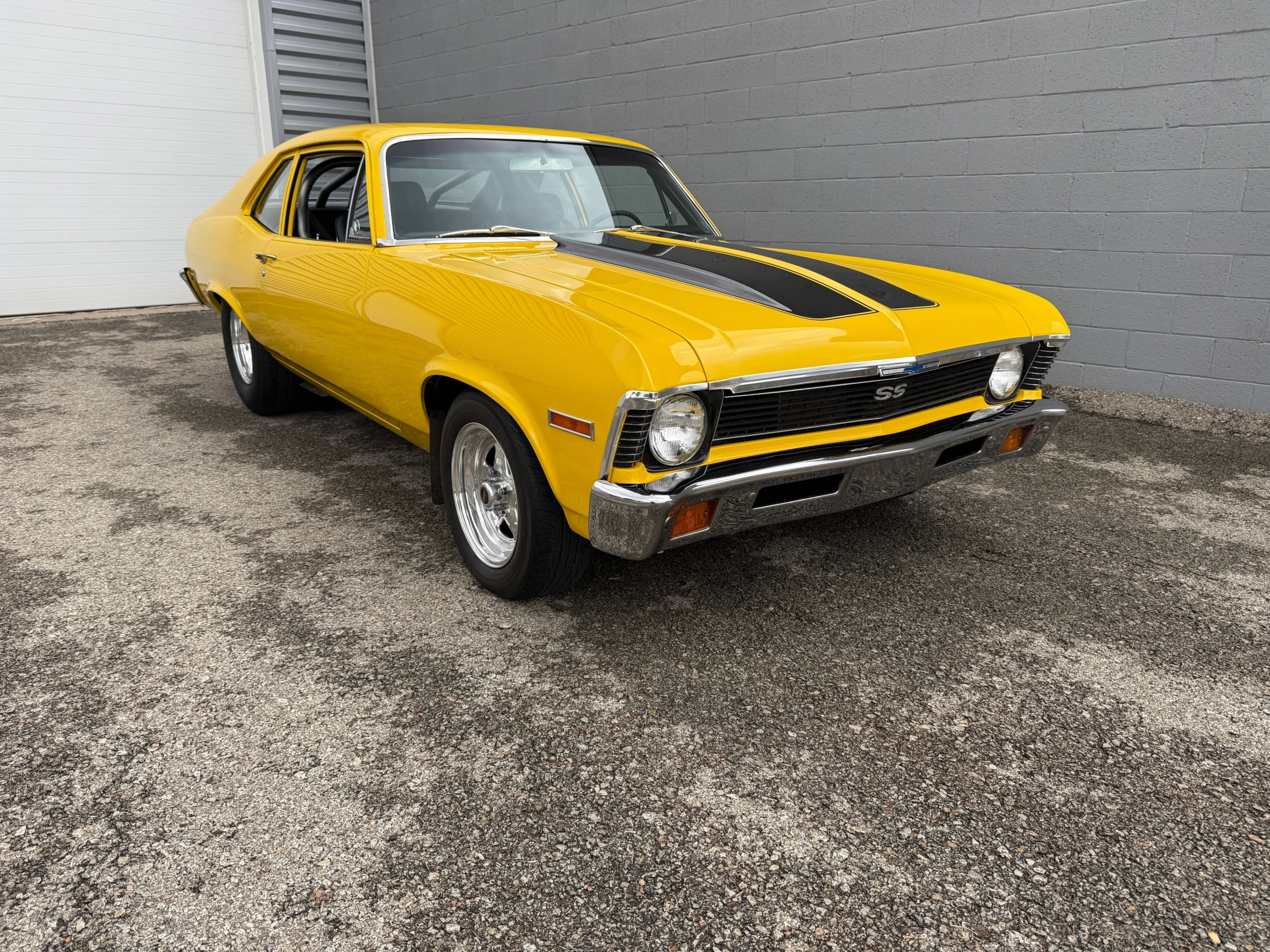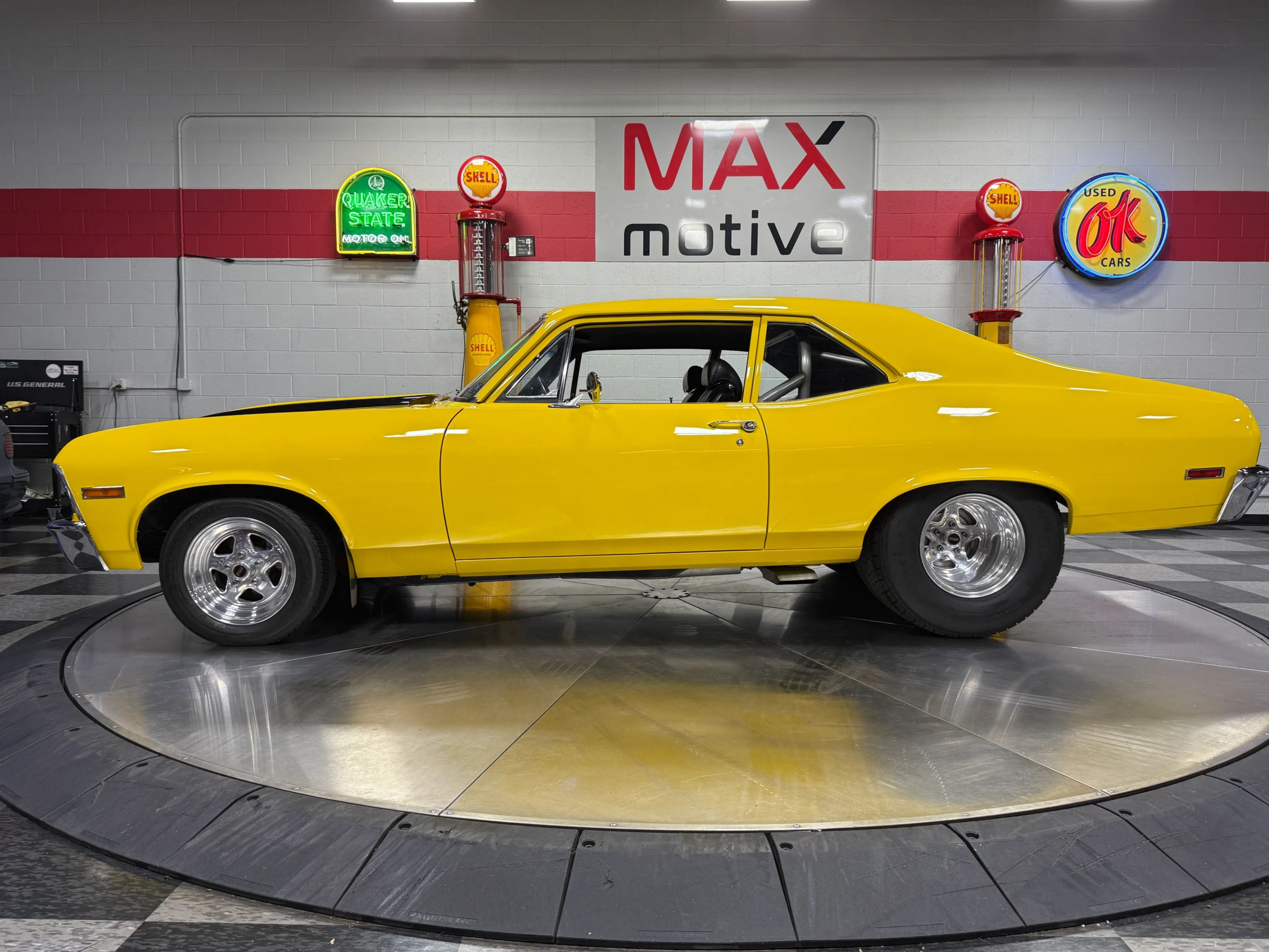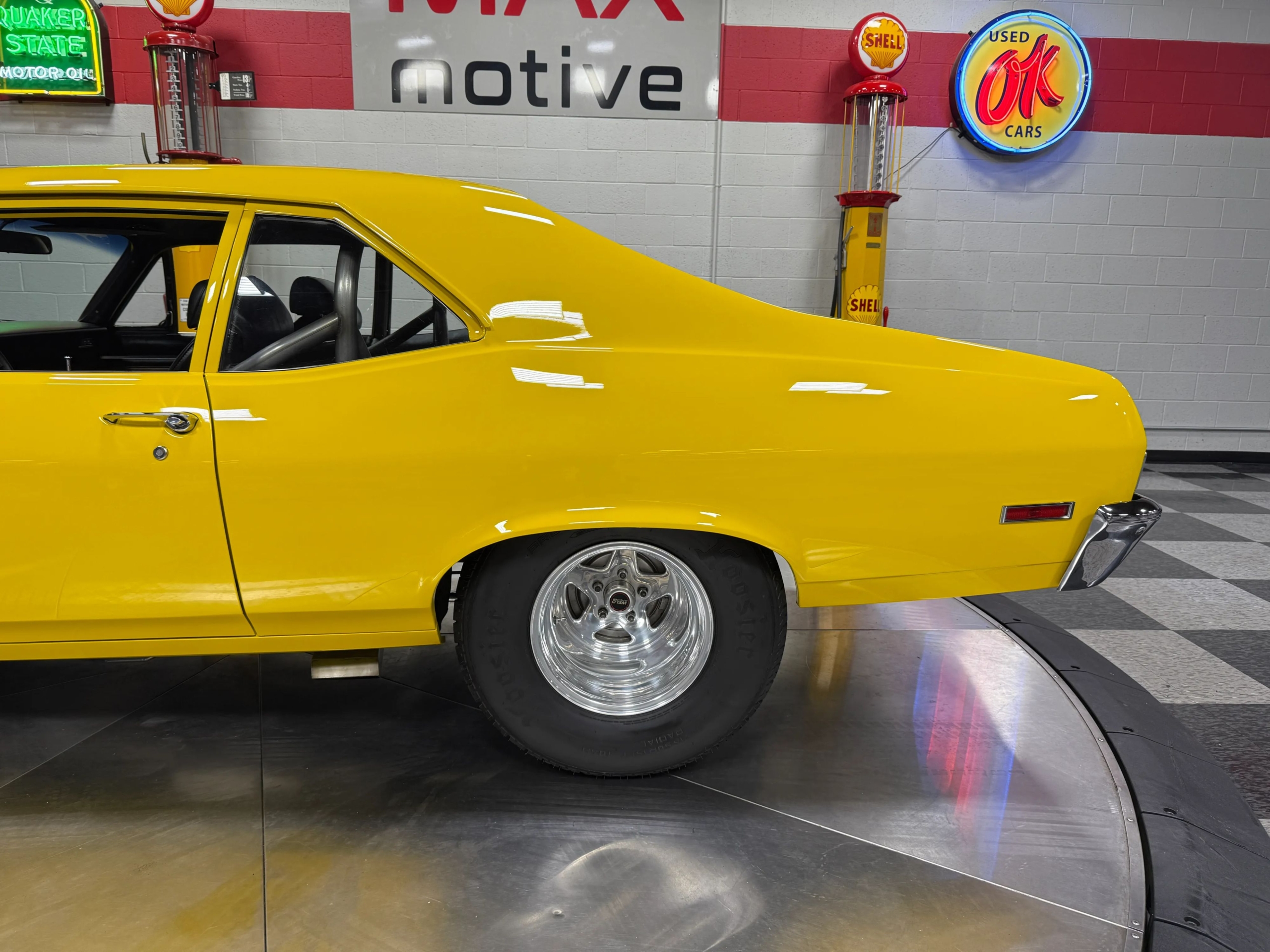 The exterior makes an immediate impression with its bright yellow paint accented by bold black stripes, a look that captures the Novas aggressive personality. Function meets form with a chromoly 6-point roll bar featuring a drivers side swing-out for easier access, a custom 3-inch Flowmaster exhaust neatly tucked under the body with side exits ahead of the rear wheels, and a set of classic Weld wheels that nail the Pro Street stance. Inside, the car is clean and purposeful, with fresh interior components and a full set of Auto Meter gauges keeping the driver connected to the big blocks vital signs.