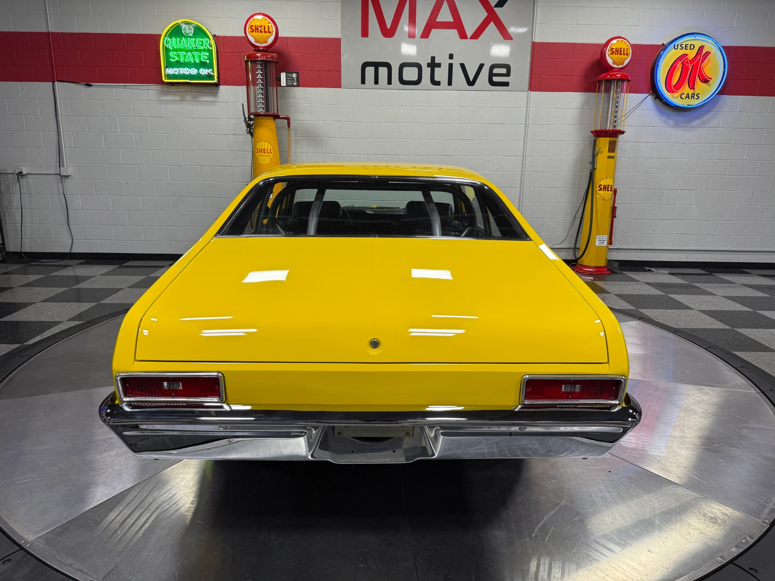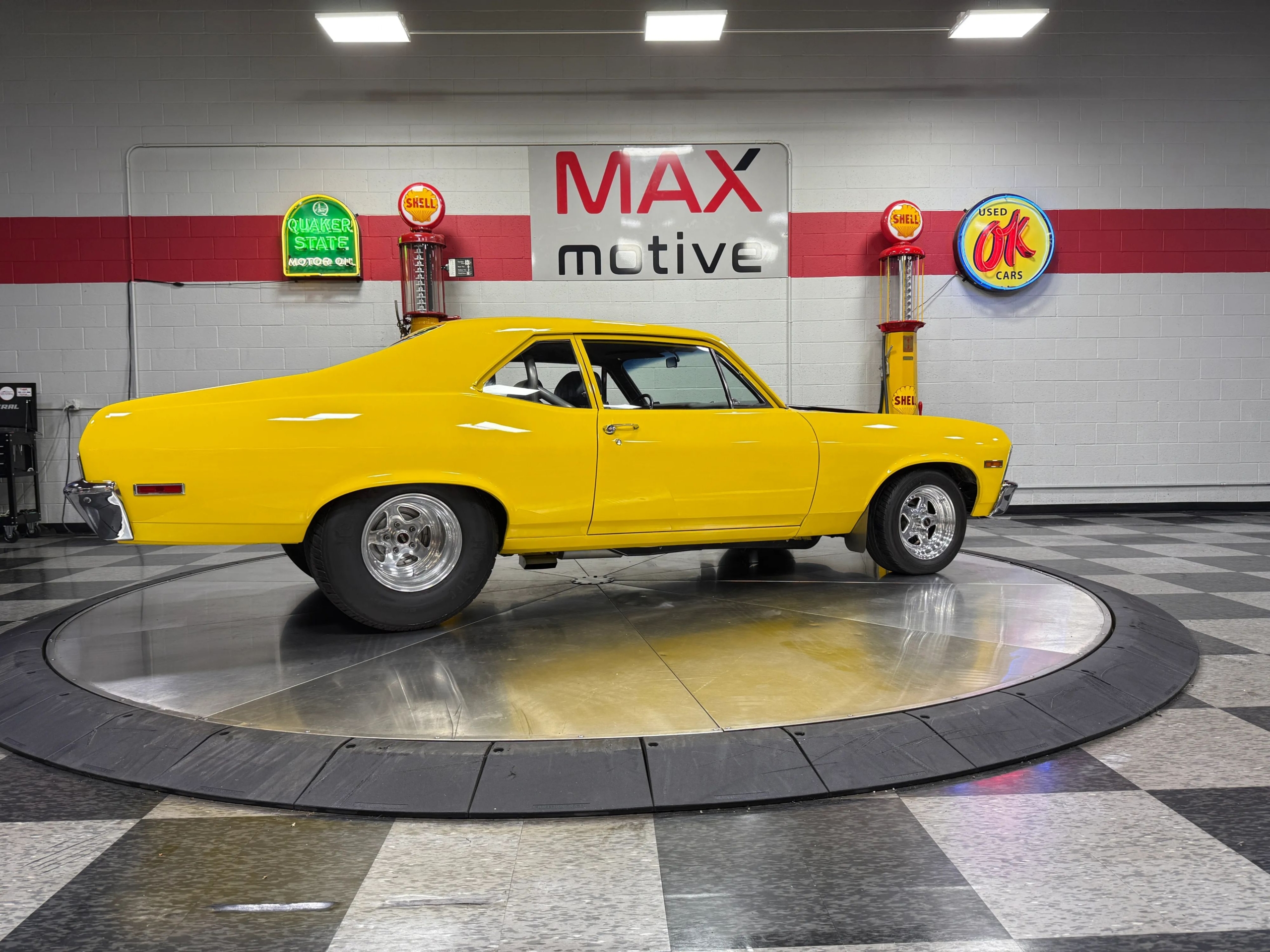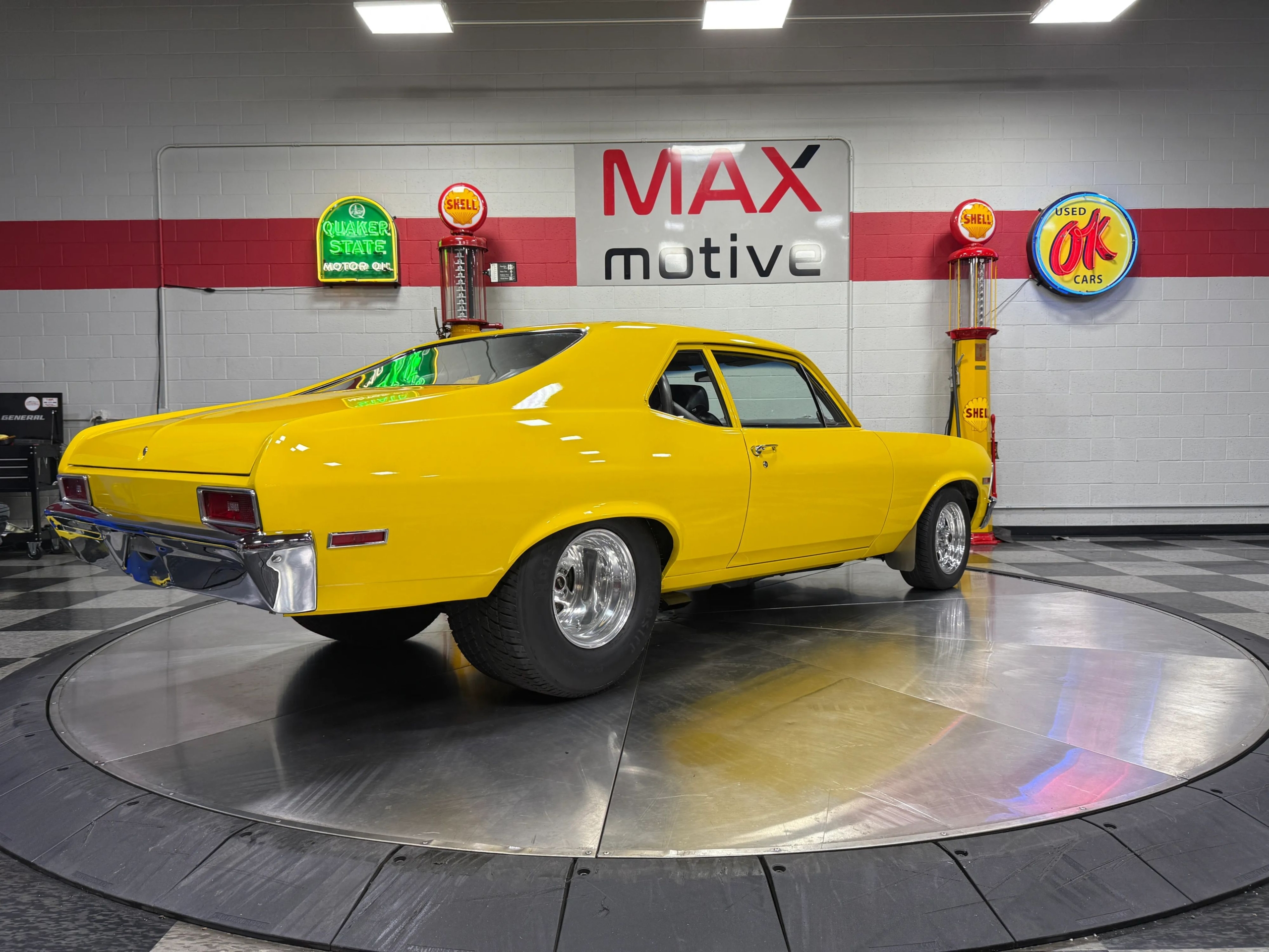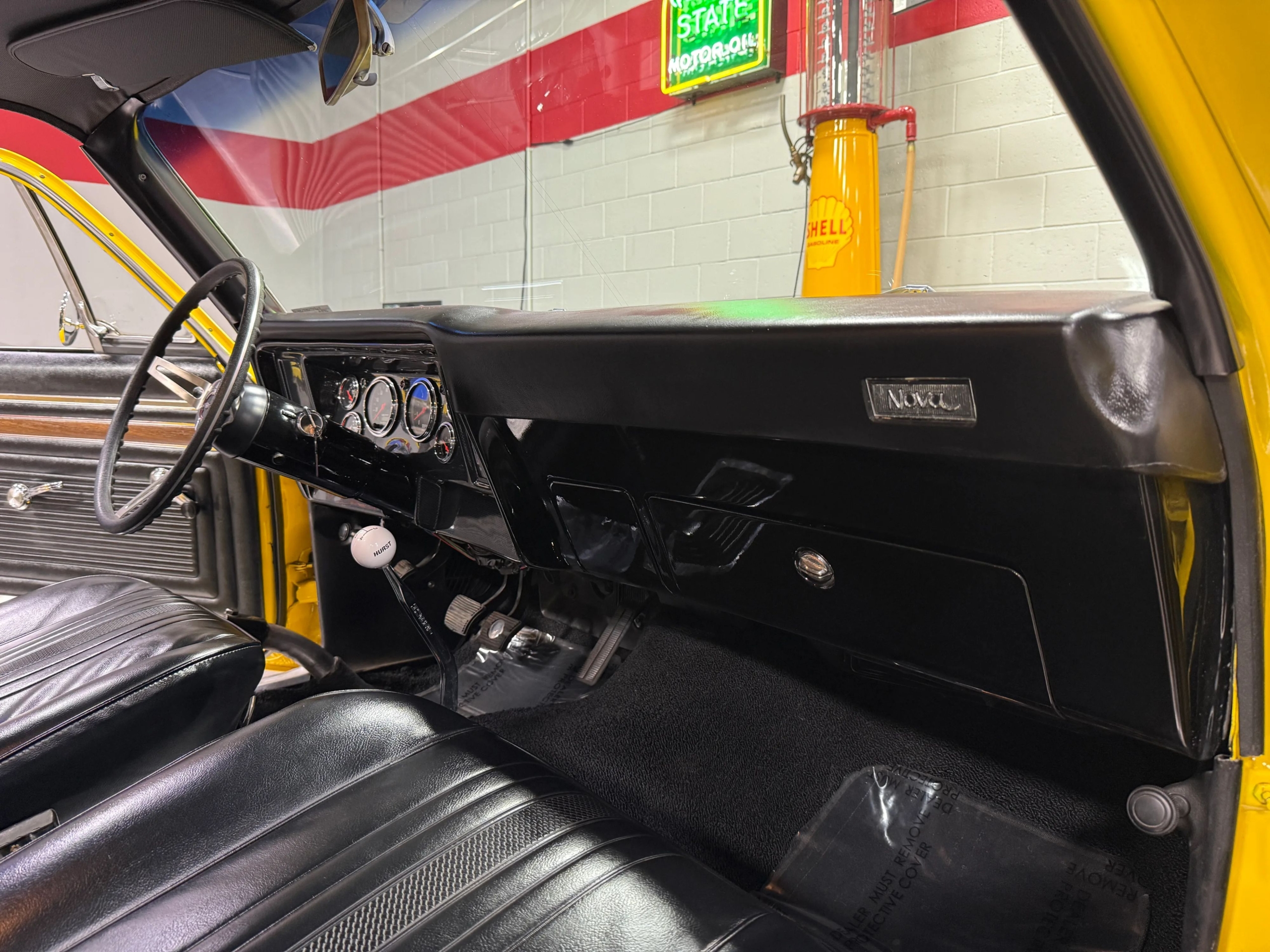 The exterior makes an immediate impression with its bright yellow paint accented by bold black stripes, a look that captures the Novas aggressive personality. Function meets form with a chromoly 6-point roll bar featuring a drivers side swing-out for easier access, a custom 3-inch Flowmaster exhaust neatly tucked under the body with side exits ahead of the rear wheels, and a set of classic Weld wheels that nail the Pro Street stance. Inside, the car is clean and purposeful, with fresh interior components and a full set of Auto Meter gauges keeping the driver connected to the big blocks vital signs.