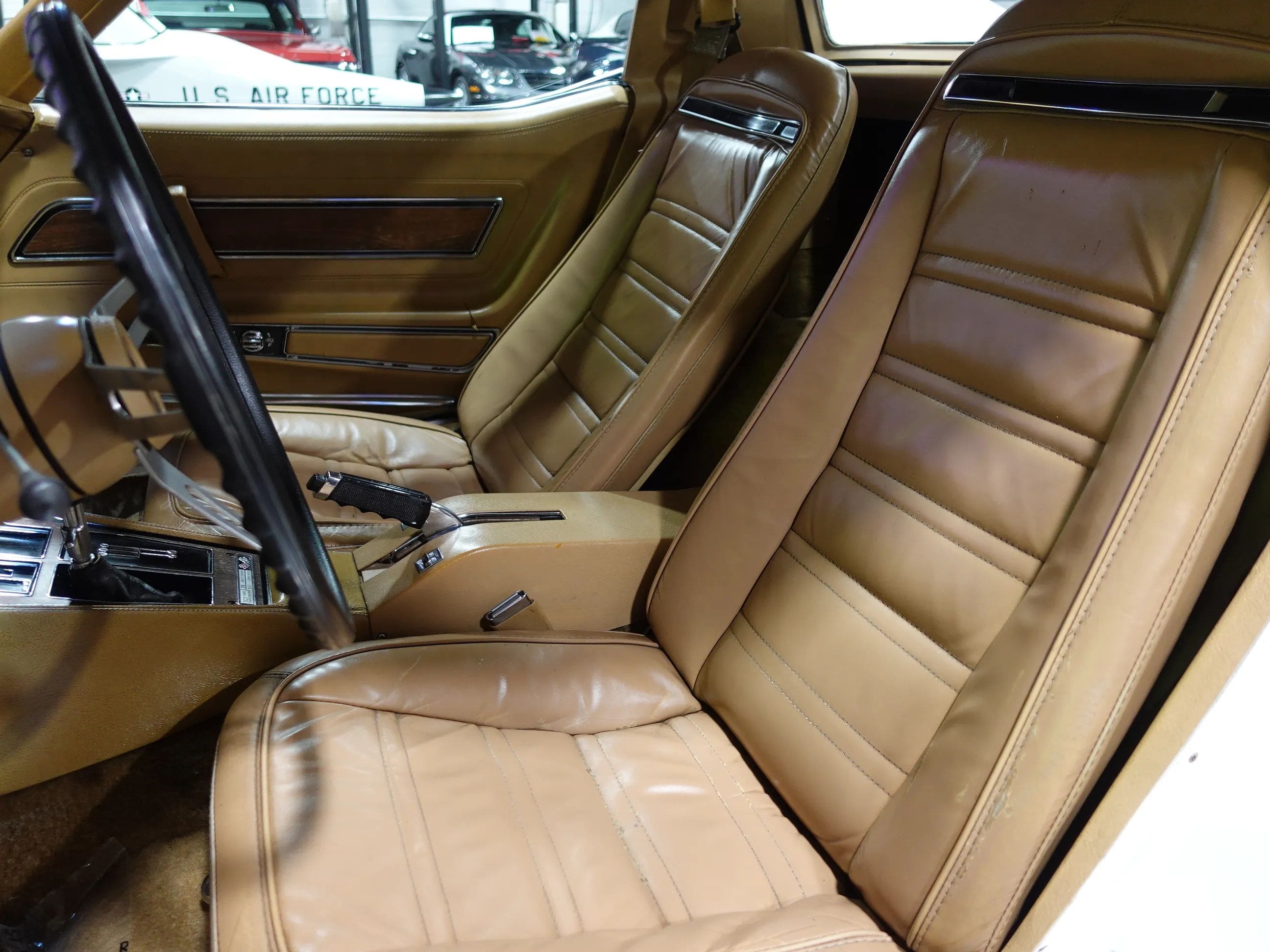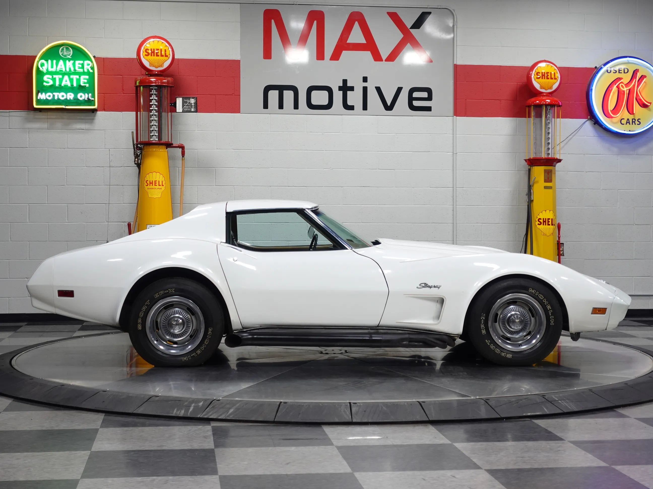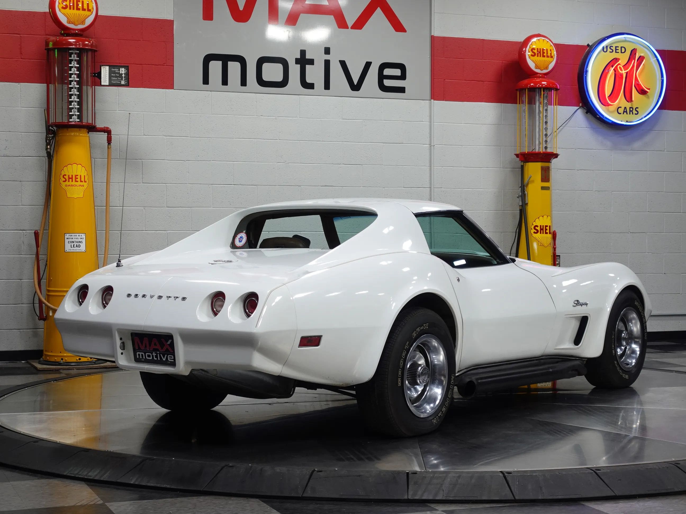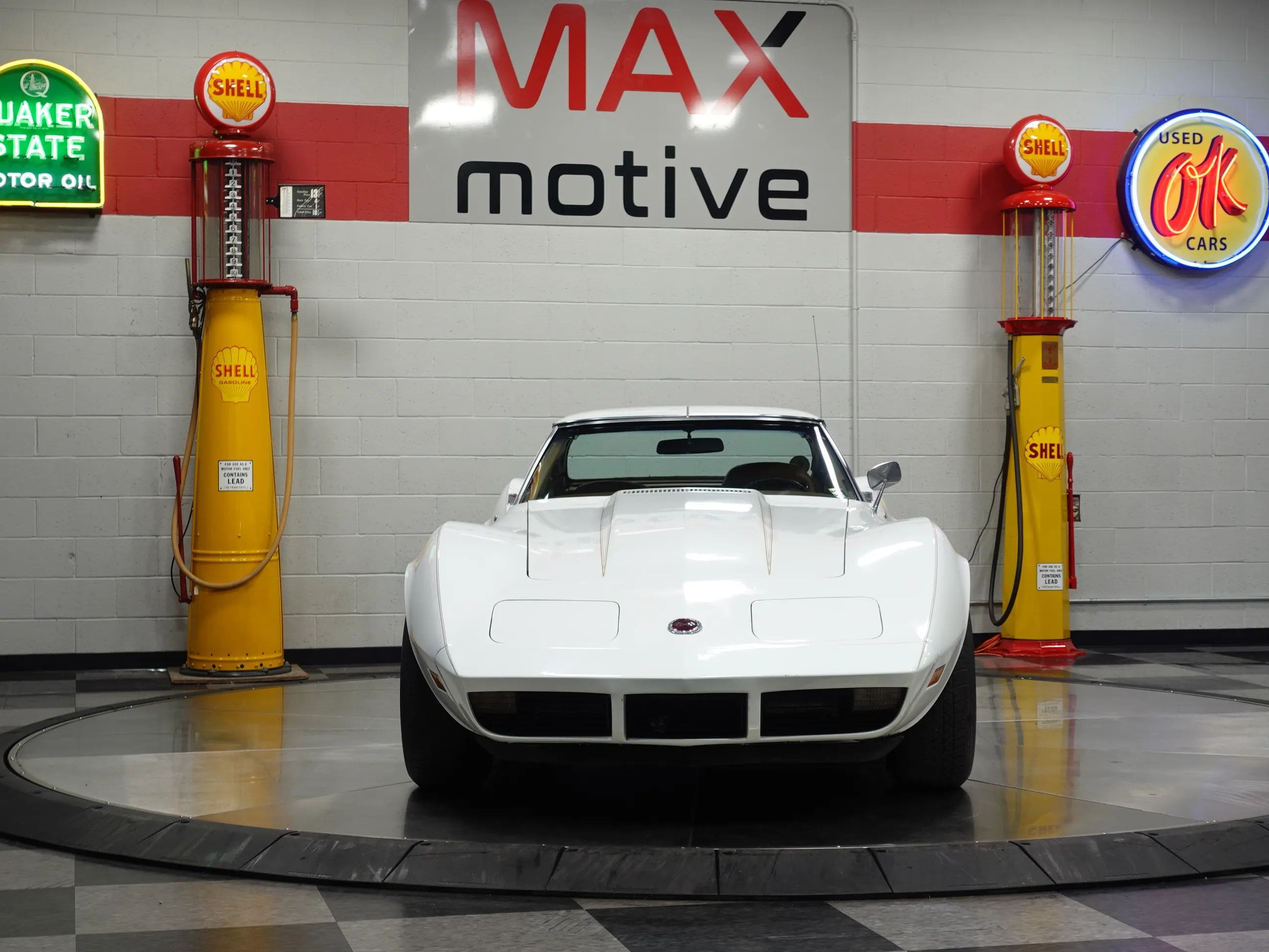 This handsome and original 1974 Chevrolet Corvette Coupe is now available from the MaxMotive Pittsburgh Showroom. The original drivetrain, consisting of the solid, numbers-matching L48 350 V8 and a four-speed manual transmission, has been left stock as has the body, the optional Custom Leather Interior, and even the Rallye wheels with hubcaps and trim rings. A complete set of Michelin tires in the stock replacement size 225/70R15 assures smooth ride and handling. The popular T-roof body allows open air motoring plus the rigid structure of a coupe. The car came equipped with air conditioning, but it is currently not blowing cold. The factory tach is also not functioning. All other systems are go, and this 1974 Chevrolet Corvette Coupe runs and looks great. Please be sure to see the detailed photos at www.maxmotive.com.