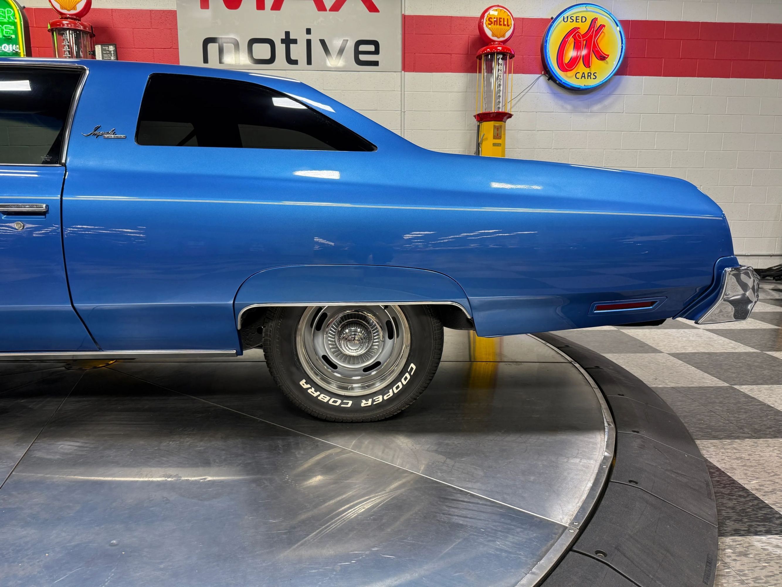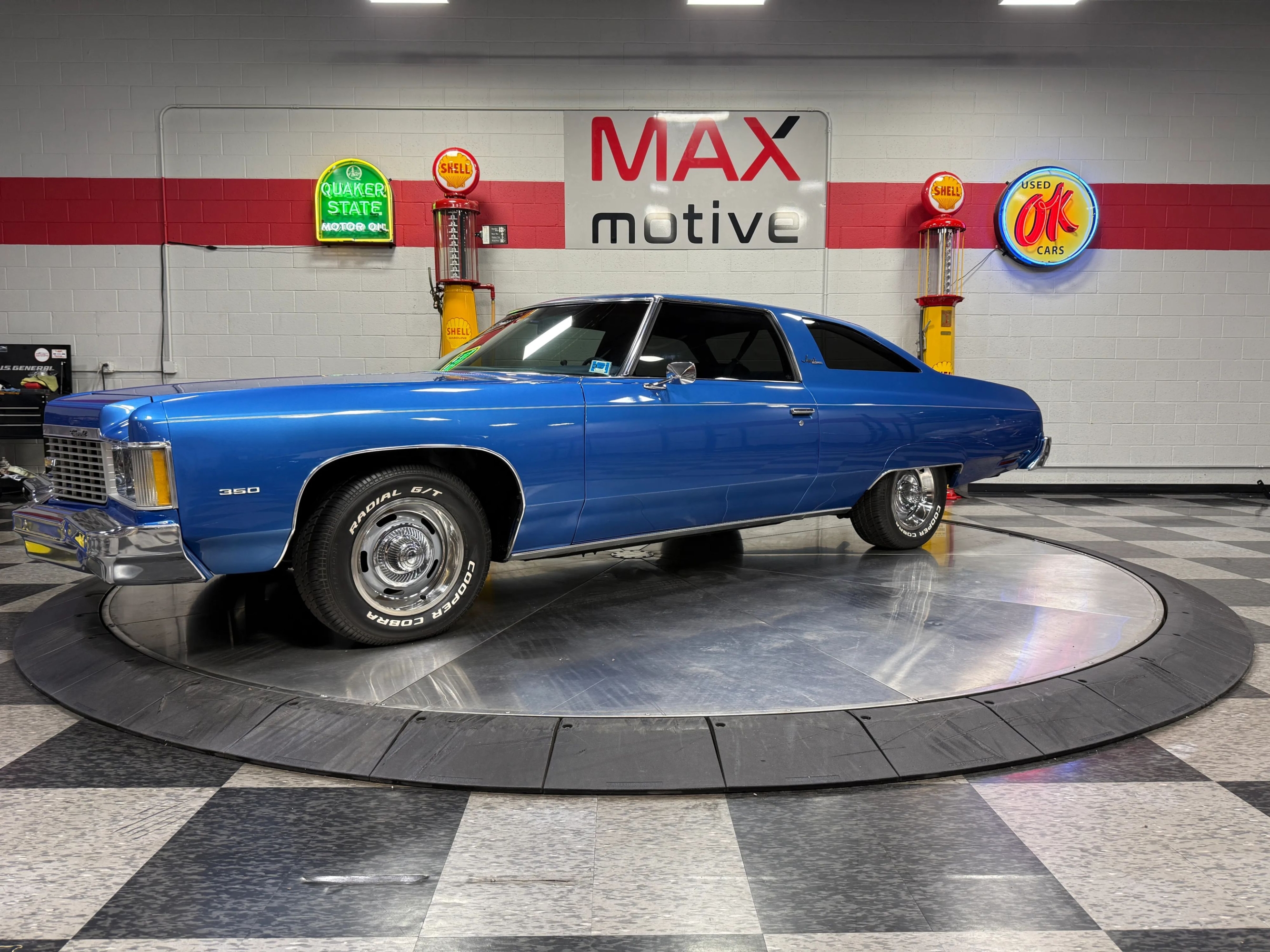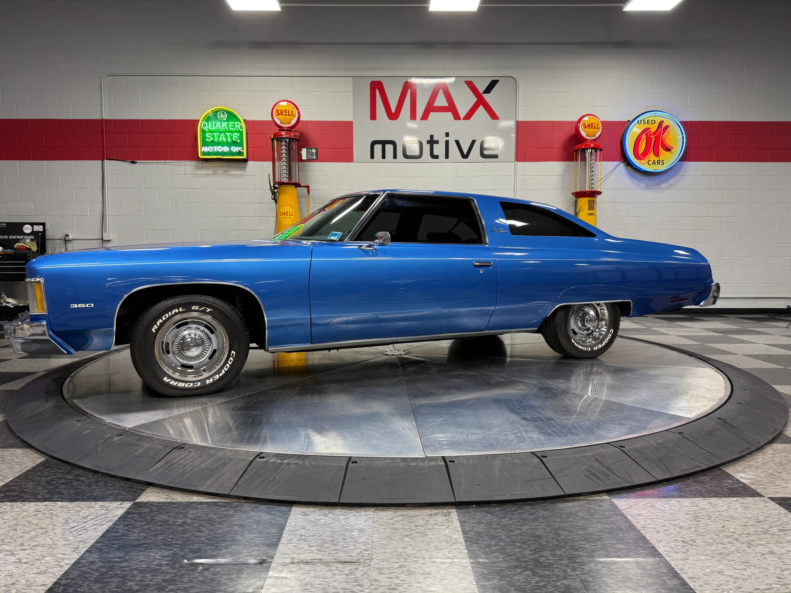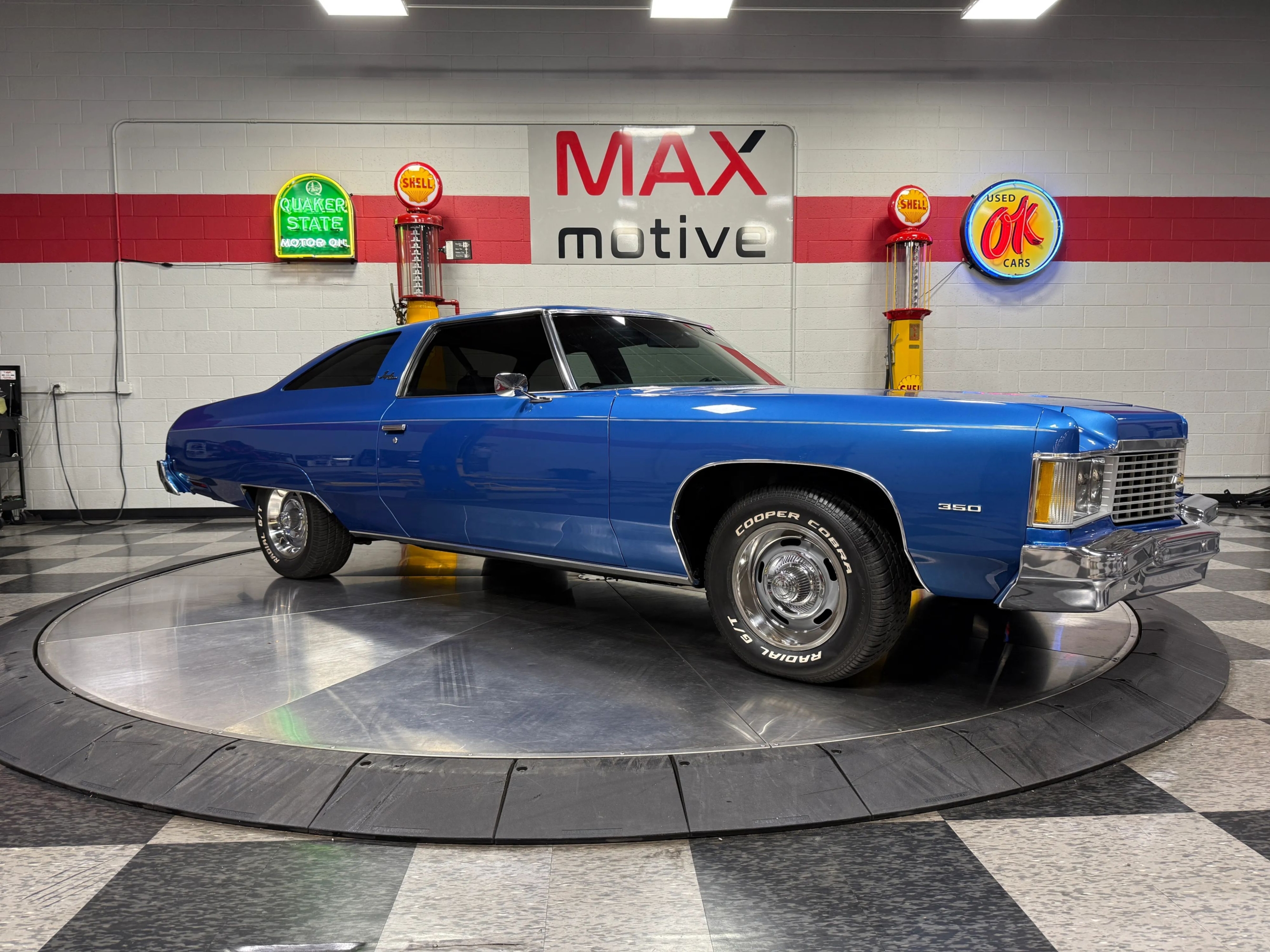 Maxmotive is proud to present this beautiful 1974 Impala Colonial 2 door hardtop. This very clean Impala boasts a strong running 350 cubic inch V-8 under the hood, paired to a 3 speed Hydramatic automatic transmission. To keep the engine flowing and breathing, a Flowmaster muffler was added, and of course who doesnt love the nice growl of a Flowmaster. The Impala was treated to a beautiful repaint in 2023. Once the body work was finished, the Impala was sprayed in a stunning blue paint. The color is essentially the same color the car rolled off the assembly line some 50 years ago. The paint shows magnificently, and really helps this Impala look the part. Tinted windows nicely offset the beautiful new blue paint. Some extra parts that are in the trunk and will be included are the original hub caps, owners manual, window sticker, and original radio. The air conditioning parts are there, but the air conditioning is not currently working. Super clean Impala, come in and test drive this long legged stunner! For more pictures and information please check out our website www.maxmotive.com