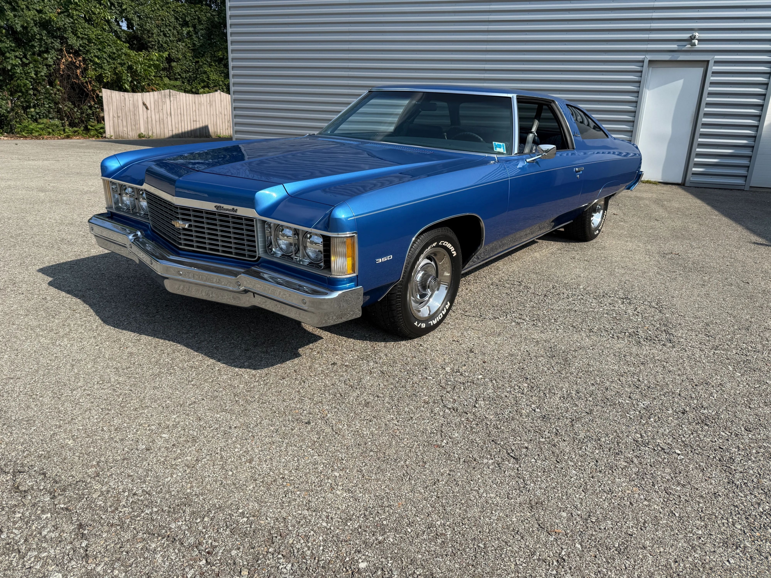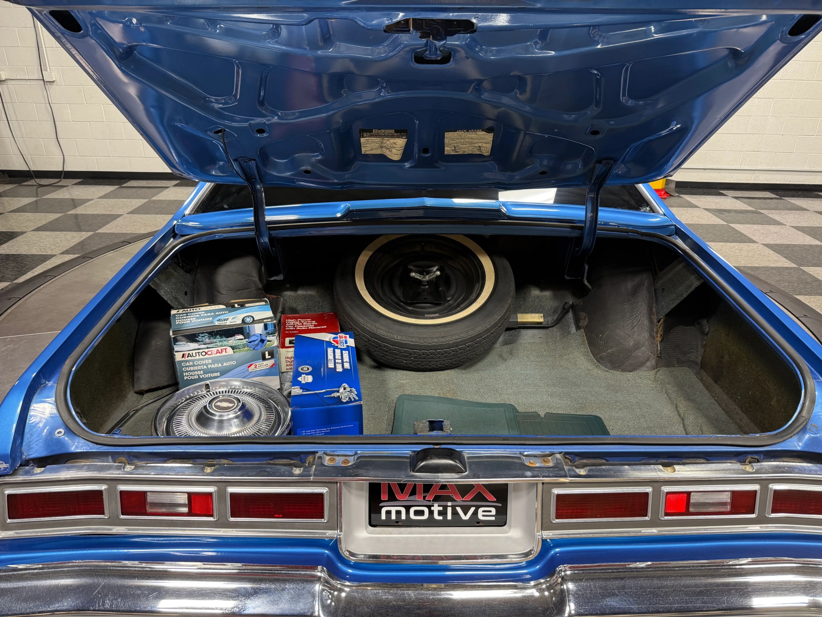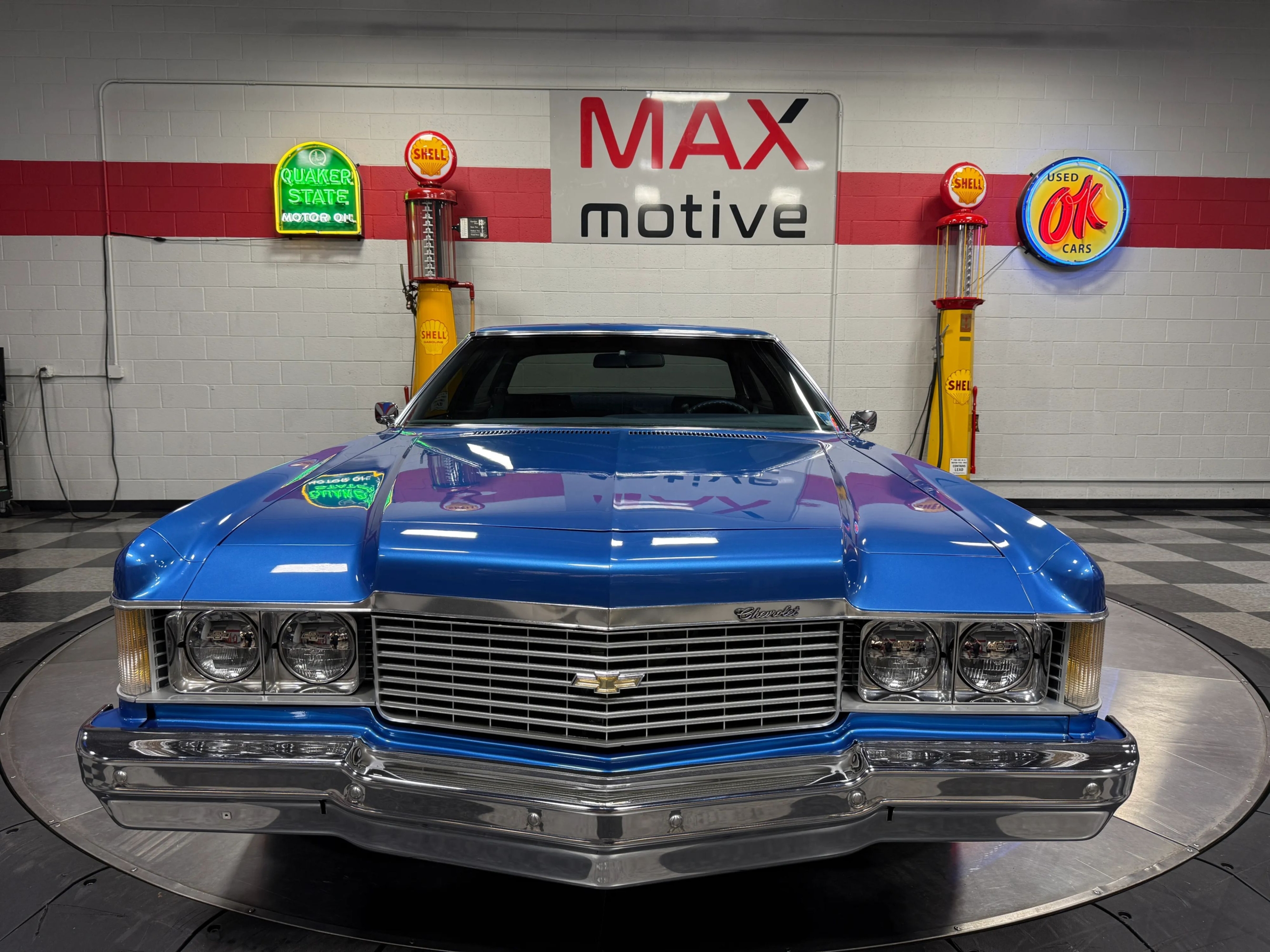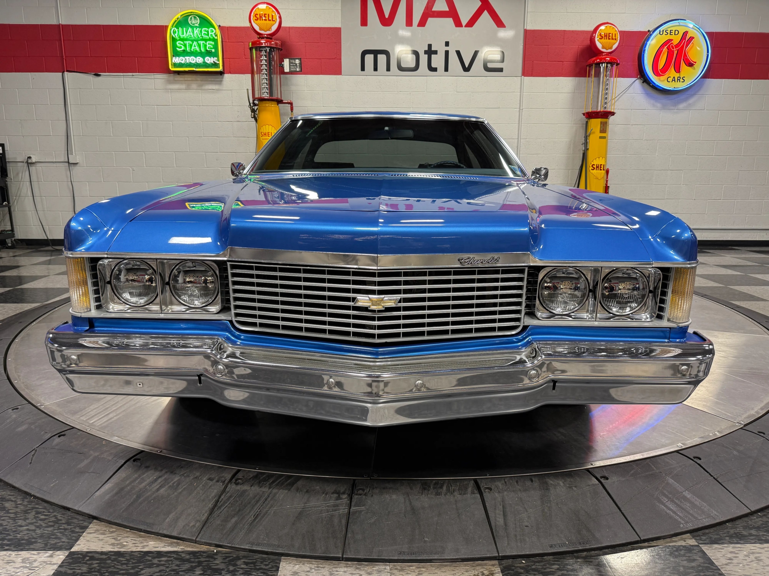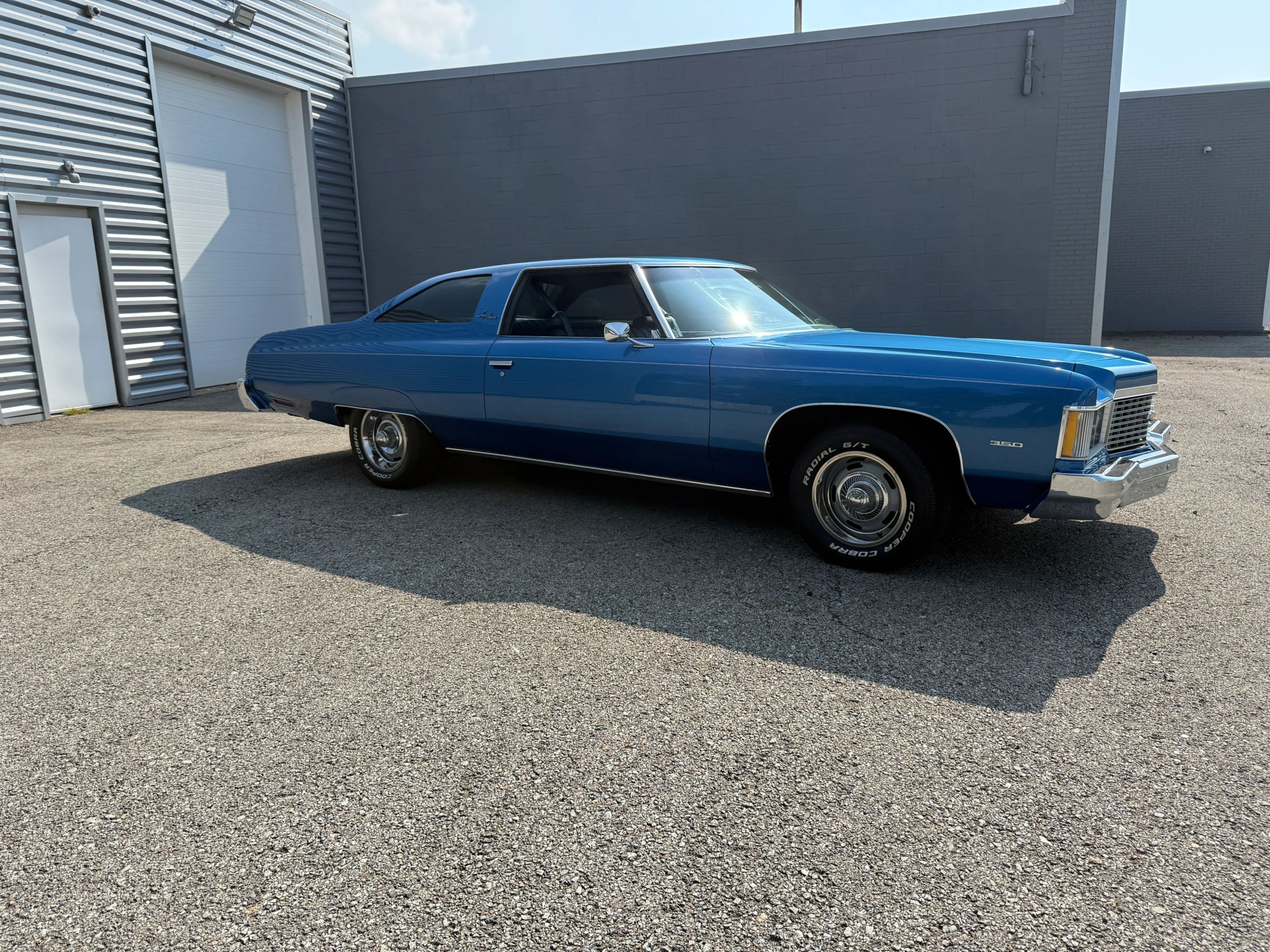 Maxmotive is proud to present this beautiful 1974 Impala Colonial 2 door hardtop. This very clean Impala boasts a strong running 350 cubic inch V-8 under the hood, paired to a 3 speed Hydramatic automatic transmission. To keep the engine flowing and breathing, a Flowmaster muffler was added, and of course who doesnt love the nice growl of a Flowmaster. The Impala was treated to a beautiful repaint in 2023. Once the body work was finished, the Impala was sprayed in a stunning blue paint. The color is essentially the same color the car rolled off the assembly line some 50 years ago. The paint shows magnificently, and really helps this Impala look the part. Tinted windows nicely offset the beautiful new blue paint. Some extra parts that are in the trunk and will be included are the original hub caps, owners manual, window sticker, and original radio. The air conditioning parts are there, but the air conditioning is not currently working. Super clean Impala, come in and test drive this long legged stunner! For more pictures and information please check out our website www.maxmotive.com