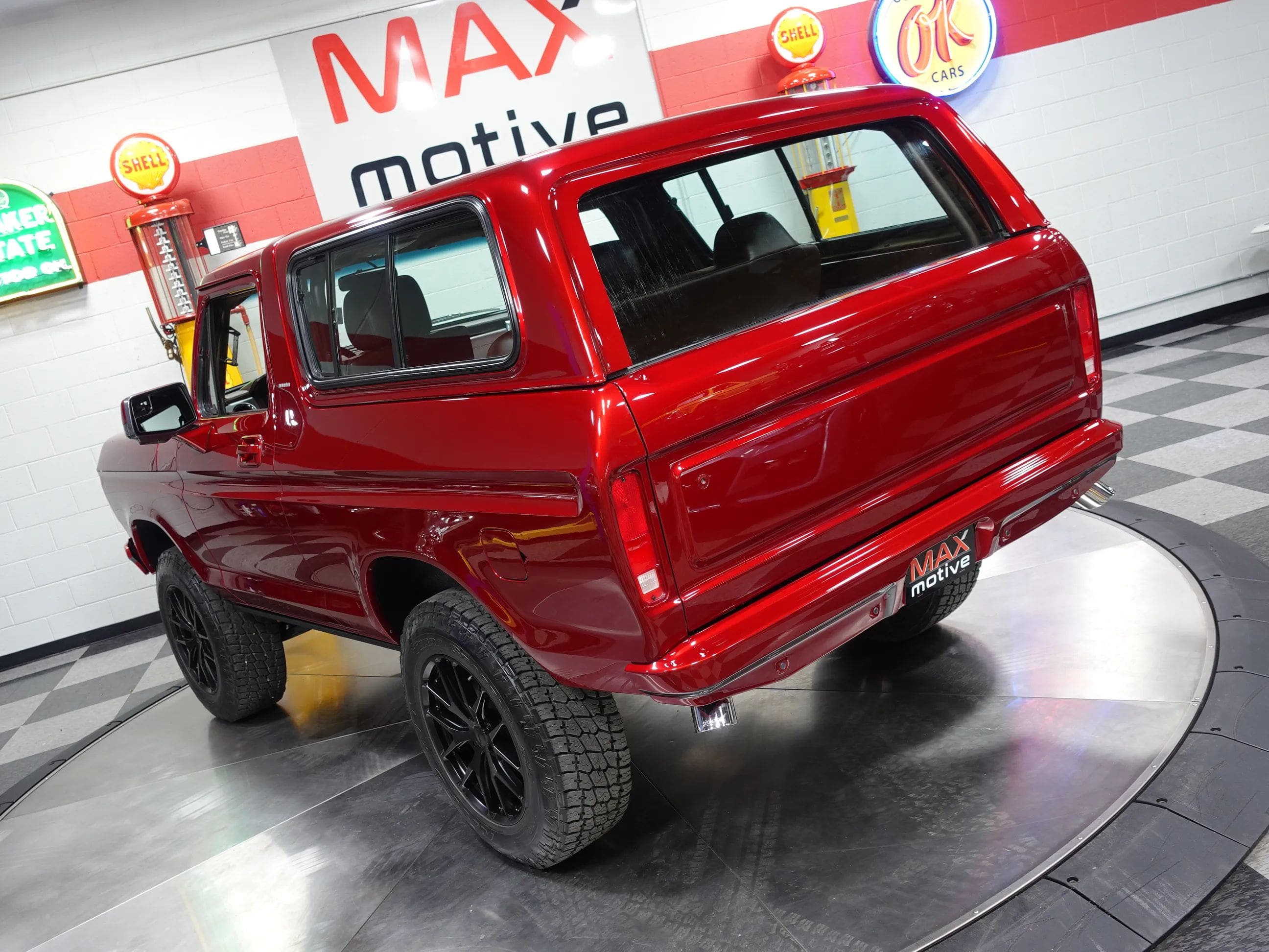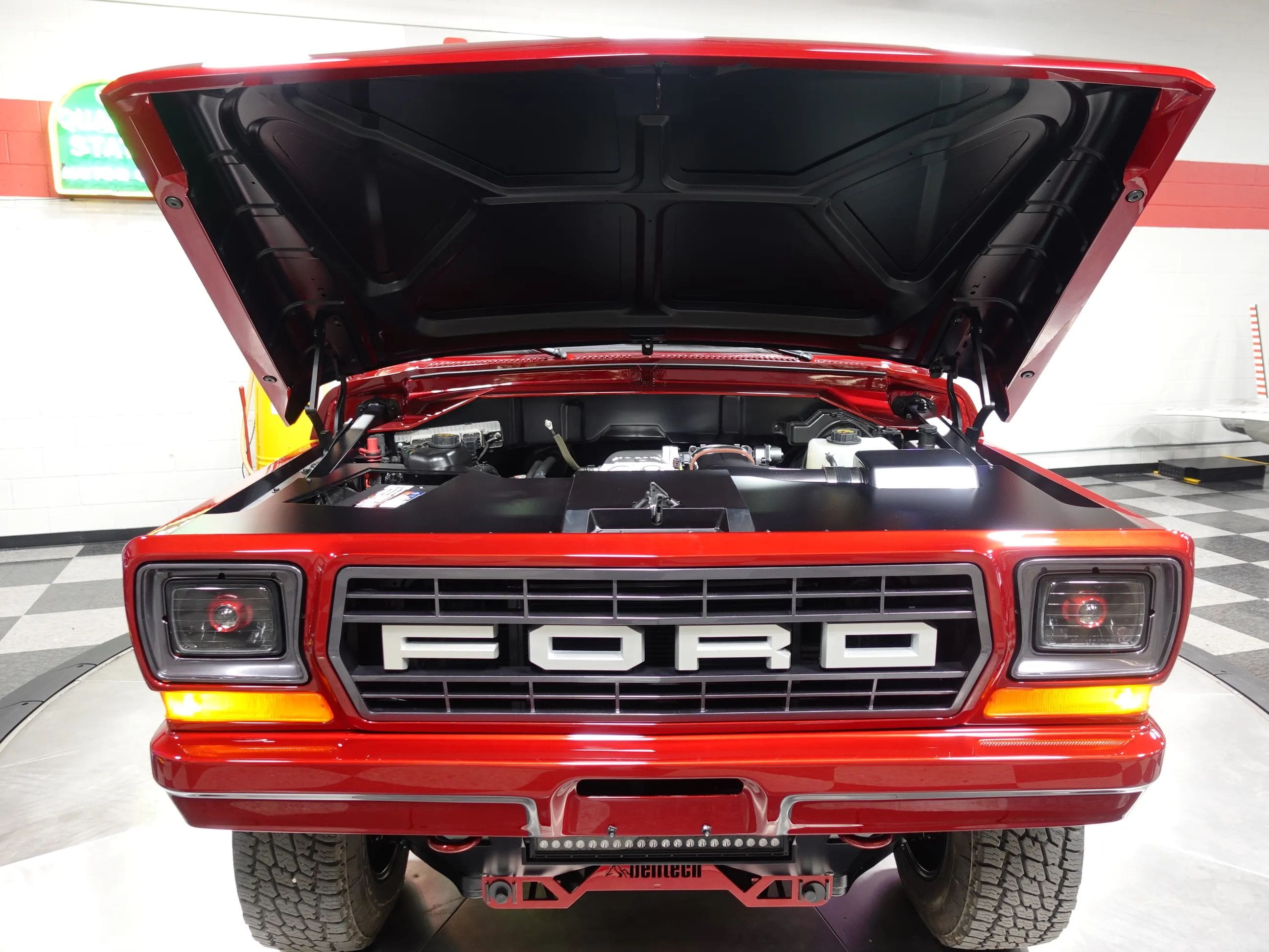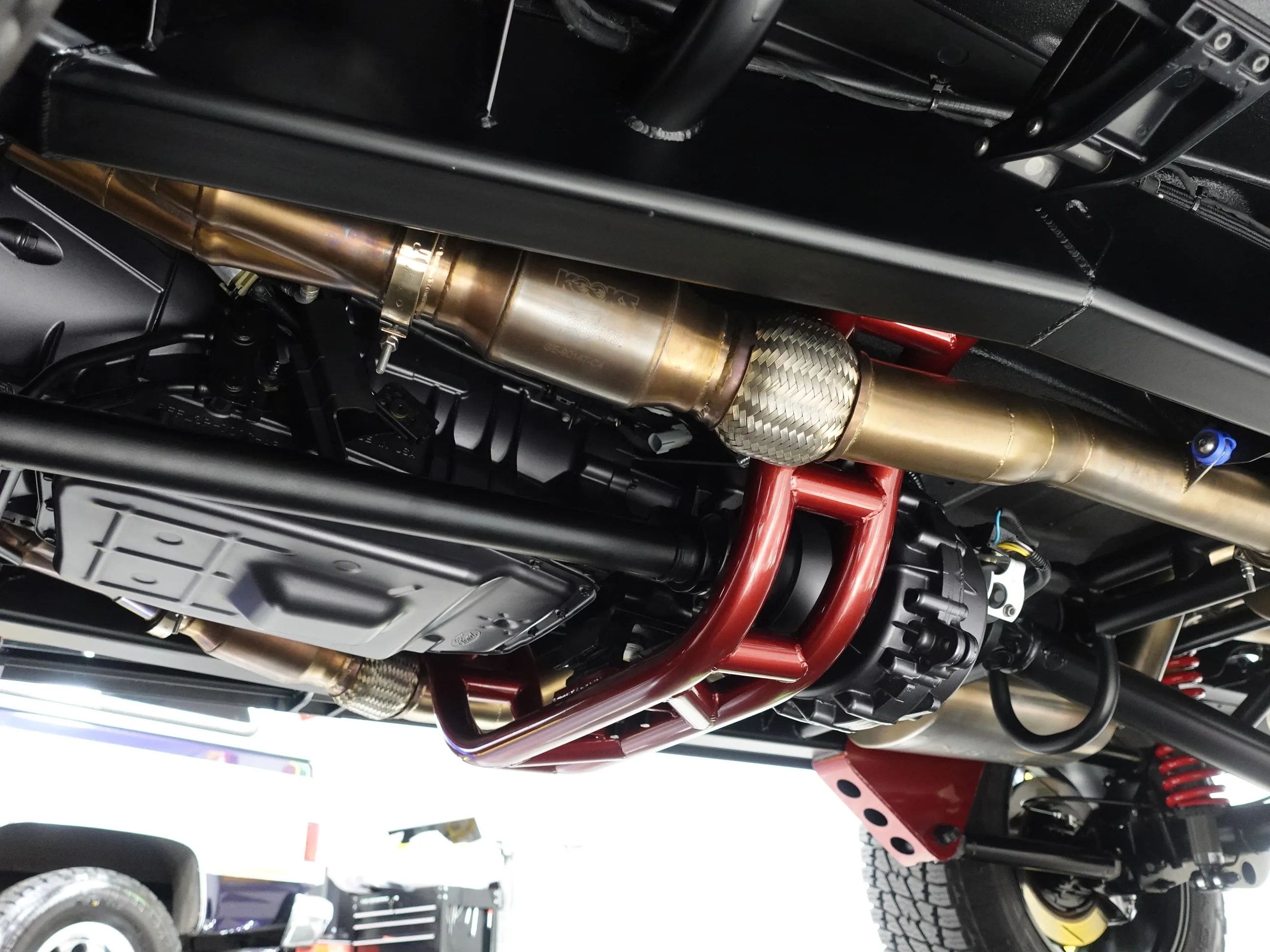 The Coyote exhales through Kooks long tube headers and a custom-built exhaust system with Kooks resonators. A 6R80 6-speed automatic transmission sends the power through a 4-mode electronic transfer case to a 9.75-inch rear with 3.73 gears and to the front 3.73-geared carrier when needed. The body shop crew augmented the custom Crimson paint with bold metallic silver in strategic spots on the exterior, the interior, and engine compartment. Hand-built front and rear body colored bumpers hide in plain sight, along with modern mirrors and door handles, and a handbuilt grille paying homage to both new and old Ford design concepts. The interior, based on a late model F-150, is elegant and luxurious with custom stitched leather and suede seating, custom floor mats, and a suede headliner. The drivers seat is 10-way adjustable, and is heated and cooled. The 8-inch LCD media center includes navigation. The chassis is tied together with a full roll cage, subtly integrated with the interior. The chassis sports a 4-link rear, Belltech coilovers all around, and Brembo brakes highlighted by painted 6-piston front calipers with 15.8 inch (!) rotors. The all-important wheel and tire combo doesn’t disappoint either. It showcases big blacked-out 20×10” Forgeline VX1-6 forged aluminum wheels wrapped in 35×11.50R20 Nitto Terra Grappler G2 All-Terrain tires. Details like the LED lights up front, dual chrome exhaust tips and even a drive shaft loop hint at the premium quality of this build. Please be sure to see the detailed photos at www.maxmotive.com.