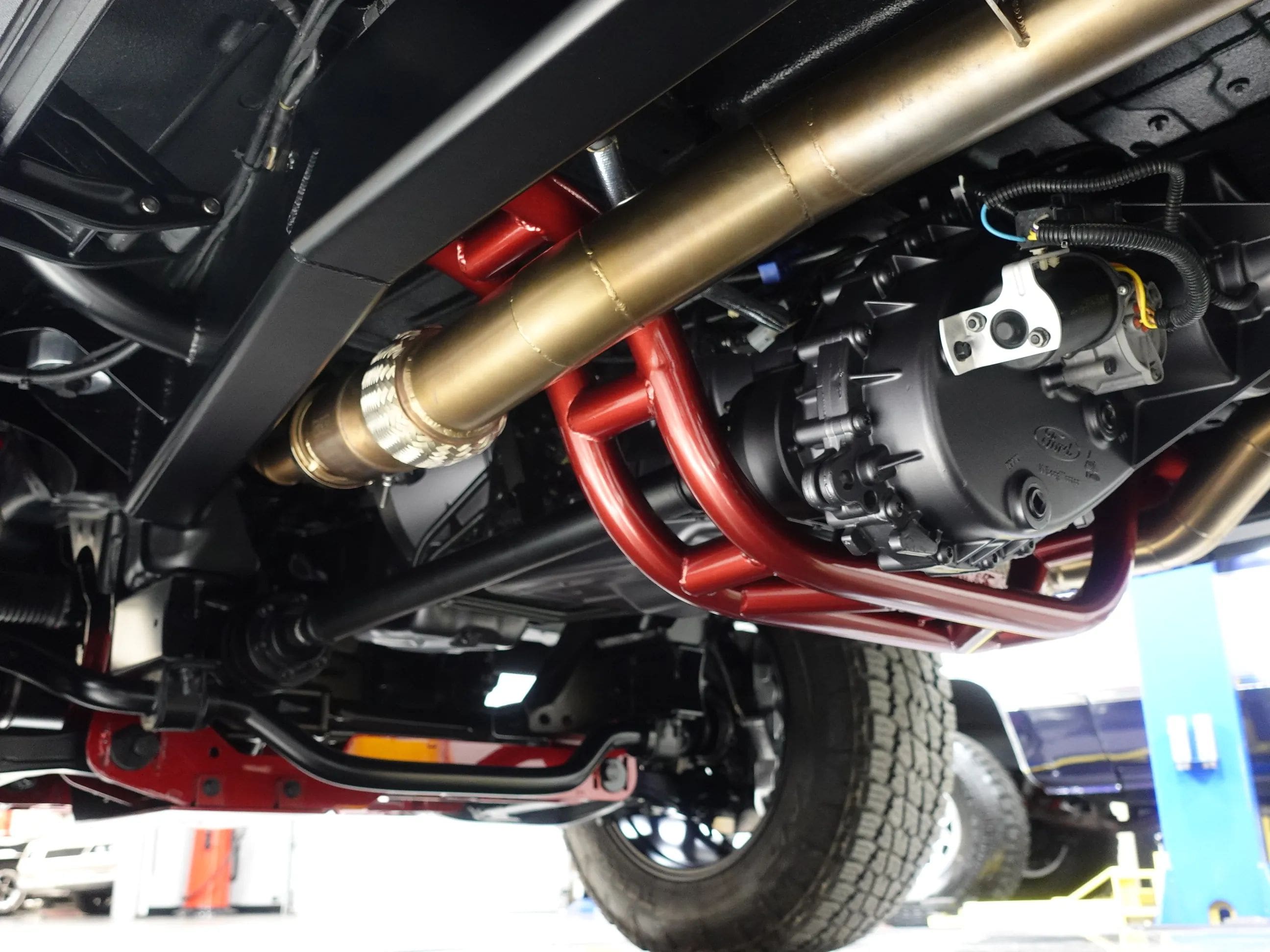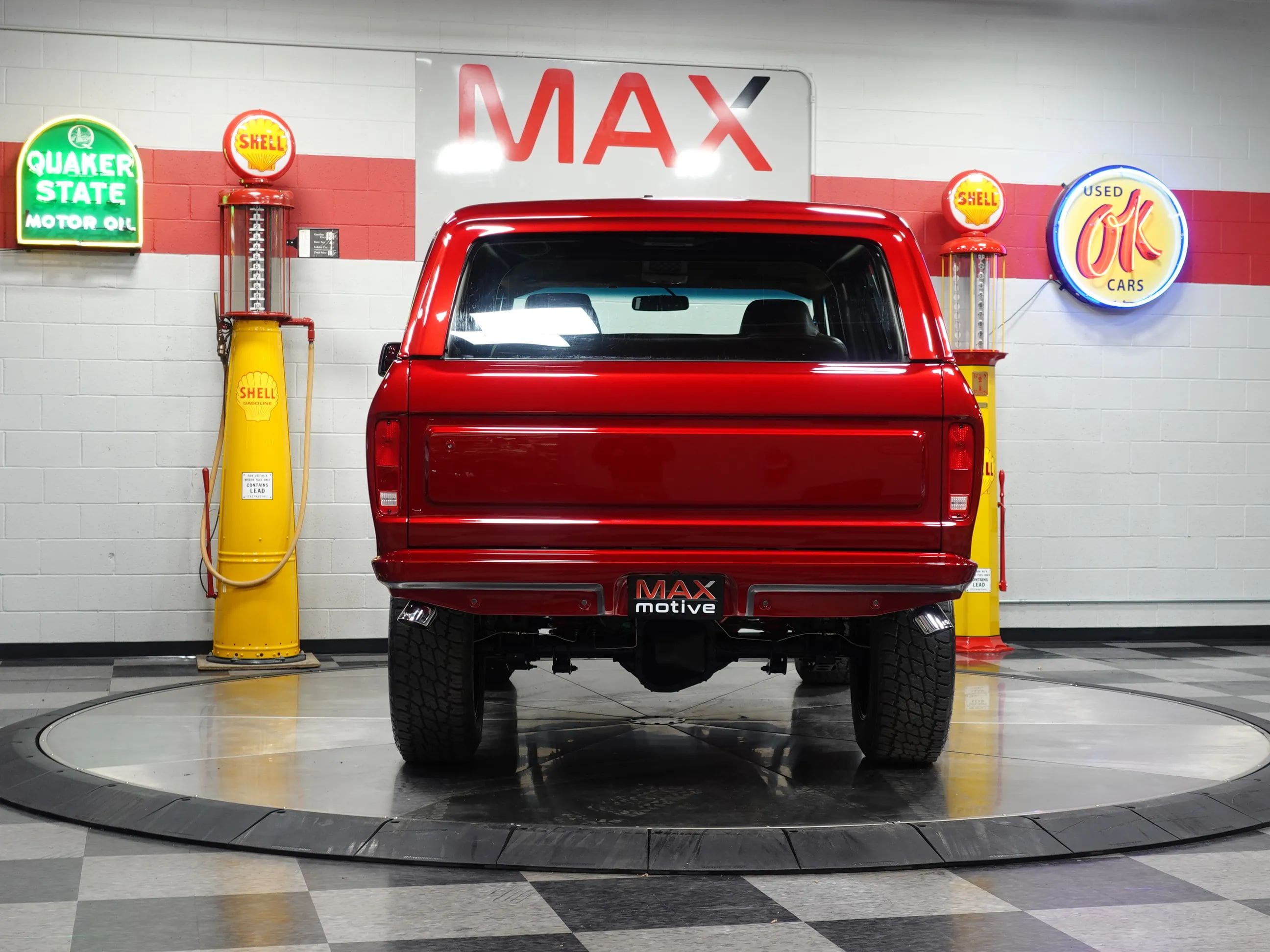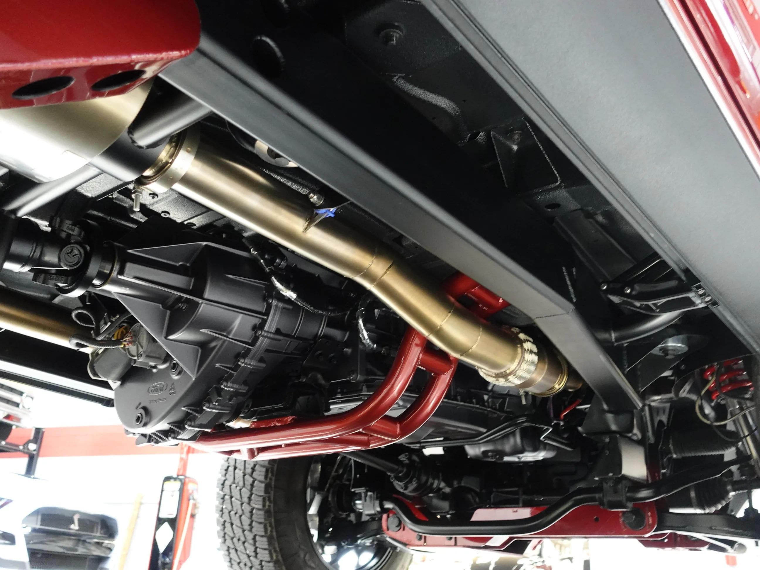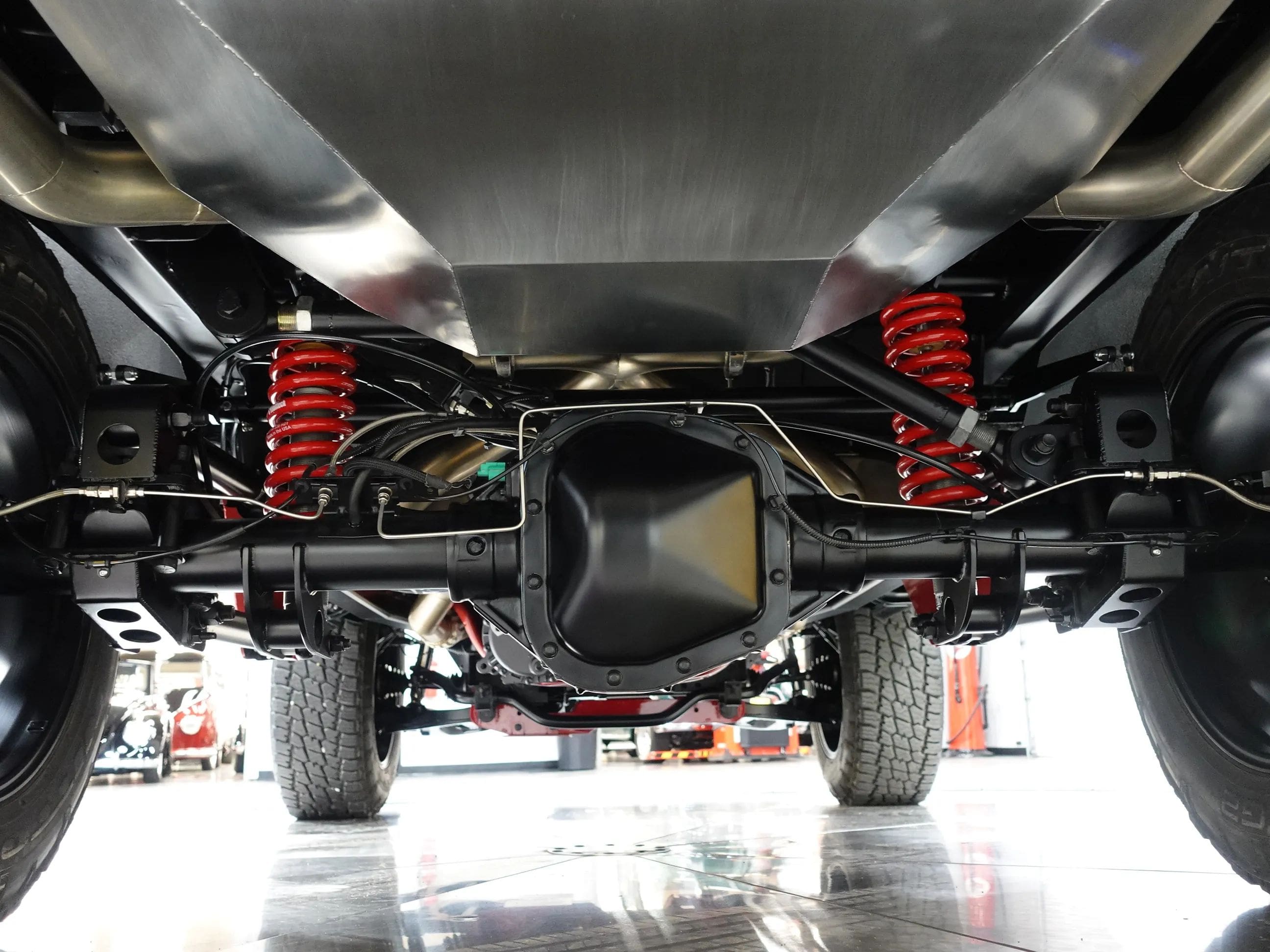 The Coyote exhales through Kooks long tube headers and a custom-built exhaust system with Kooks resonators. A 6R80 6-speed automatic transmission sends the power through a 4-mode electronic transfer case to a 9.75-inch rear with 3.73 gears and to the front 3.73-geared carrier when needed. The body shop crew augmented the custom Crimson paint with bold metallic silver in strategic spots on the exterior, the interior, and engine compartment. Hand-built front and rear body colored bumpers hide in plain sight, along with modern mirrors and door handles, and a handbuilt grille paying homage to both new and old Ford design concepts. The interior, based on a late model F-150, is elegant and luxurious with custom stitched leather and suede seating, custom floor mats, and a suede headliner. The drivers seat is 10-way adjustable, and is heated and cooled. The 8-inch LCD media center includes navigation. The chassis is tied together with a full roll cage, subtly integrated with the interior. The chassis sports a 4-link rear, Belltech coilovers all around, and Brembo brakes highlighted by painted 6-piston front calipers with 15.8 inch (!) rotors. The all-important wheel and tire combo doesn’t disappoint either. It showcases big blacked-out 20×10” Forgeline VX1-6 forged aluminum wheels wrapped in 35×11.50R20 Nitto Terra Grappler G2 All-Terrain tires. Details like the LED lights up front, dual chrome exhaust tips and even a drive shaft loop hint at the premium quality of this build. Please be sure to see the detailed photos at www.maxmotive.com.