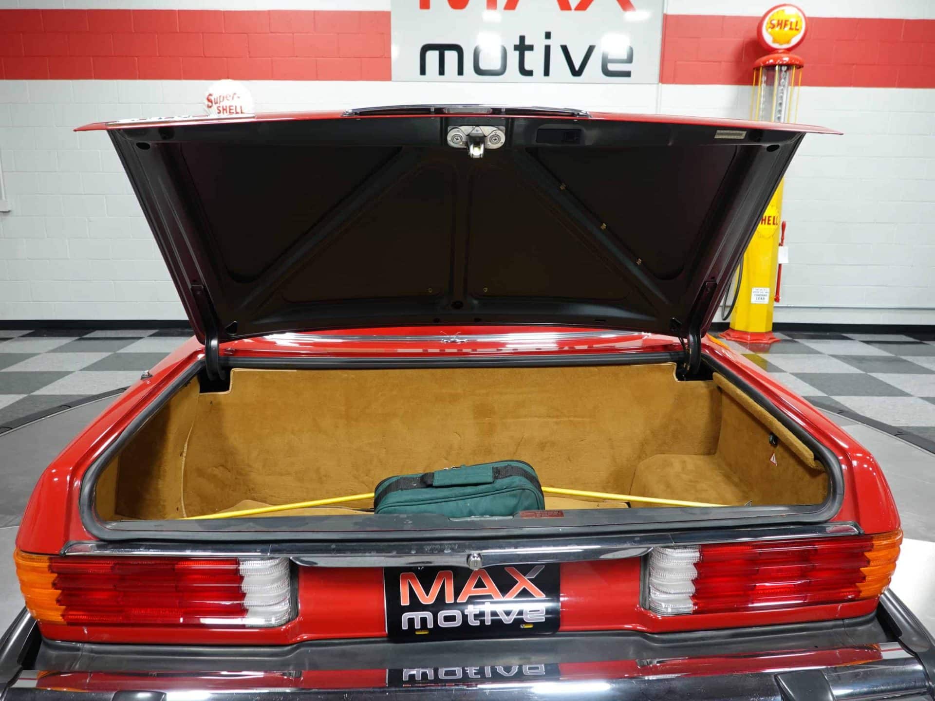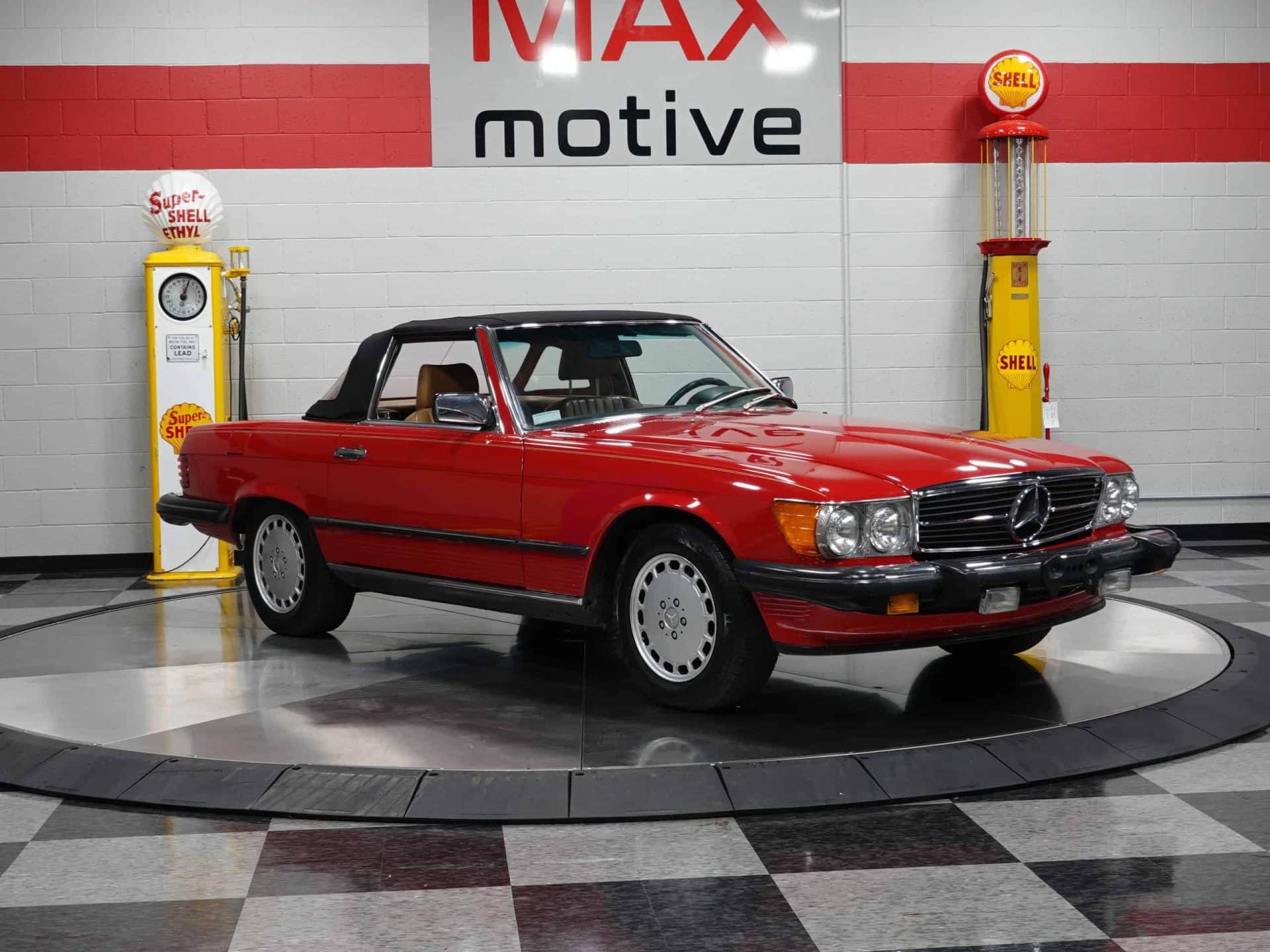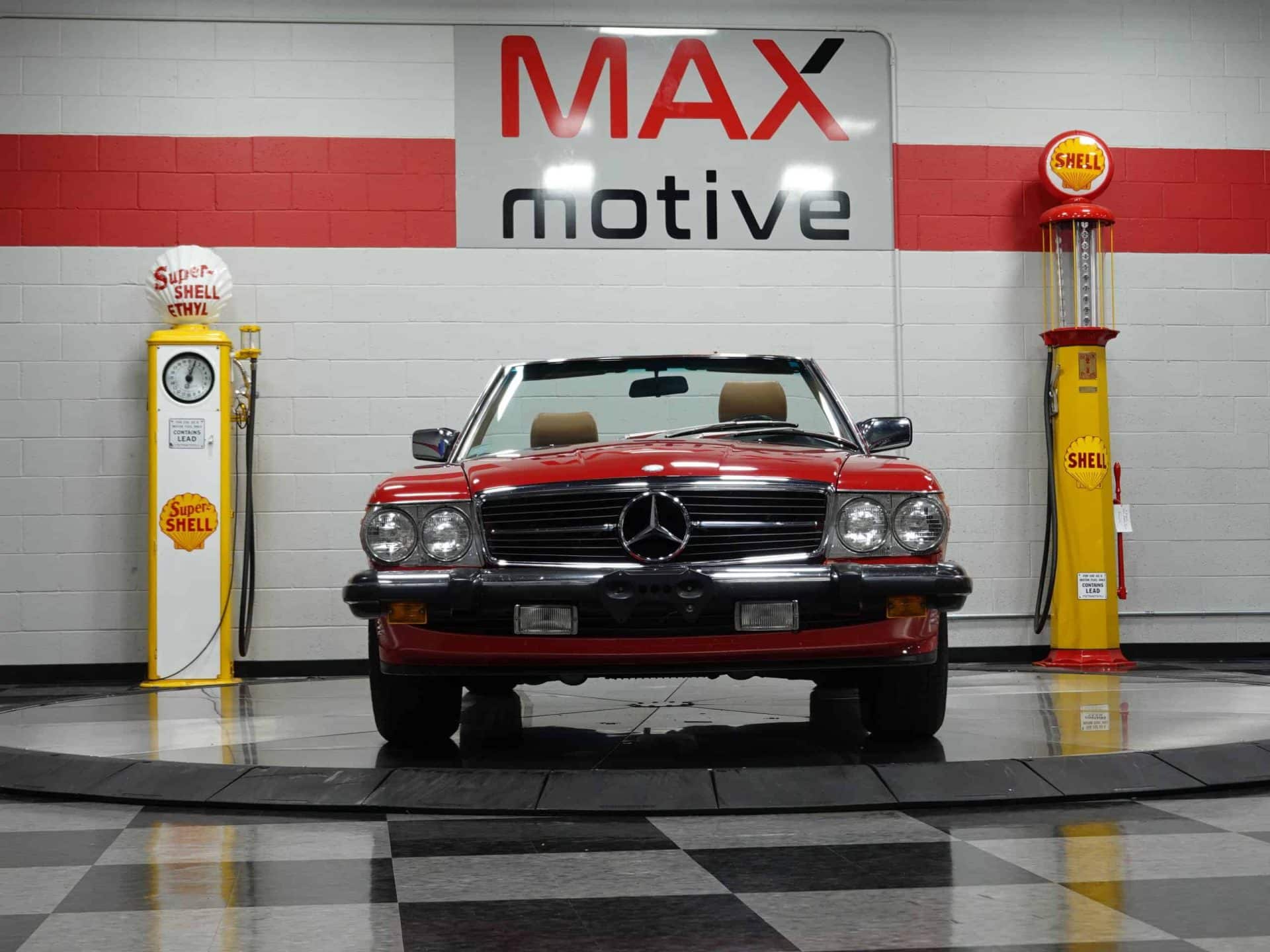 This 1987 Mercedes Benz 560SL proudly wears the three point star on its grille. It is a stunning example of the breed in Signal Red with a mere 28246 actual miles. It features the all-aluminum 5.6L V8 engine that was exclusive to the North American market. The 560SL is beloved today because of its combination of looks, performance suited to American roads and tastes, sure-footed independent suspension handling, and the attention to detail and engineering characteristic of a Benz. For example, oil and coolant level indicators, brake pad wear indicator, outside temperature indicator (thermometer), and a full gauge package that includes a tachometer of course, but also an Economy gauge to help you save fuel are all items seldom seen even today. Other amenities, such as air conditioning, cruise control and power windows, locks and mirrors were also standard equipment. The original aluminum wheels remain in place and complete the stately Mercedes appearance. The car has always been professionally maintained.