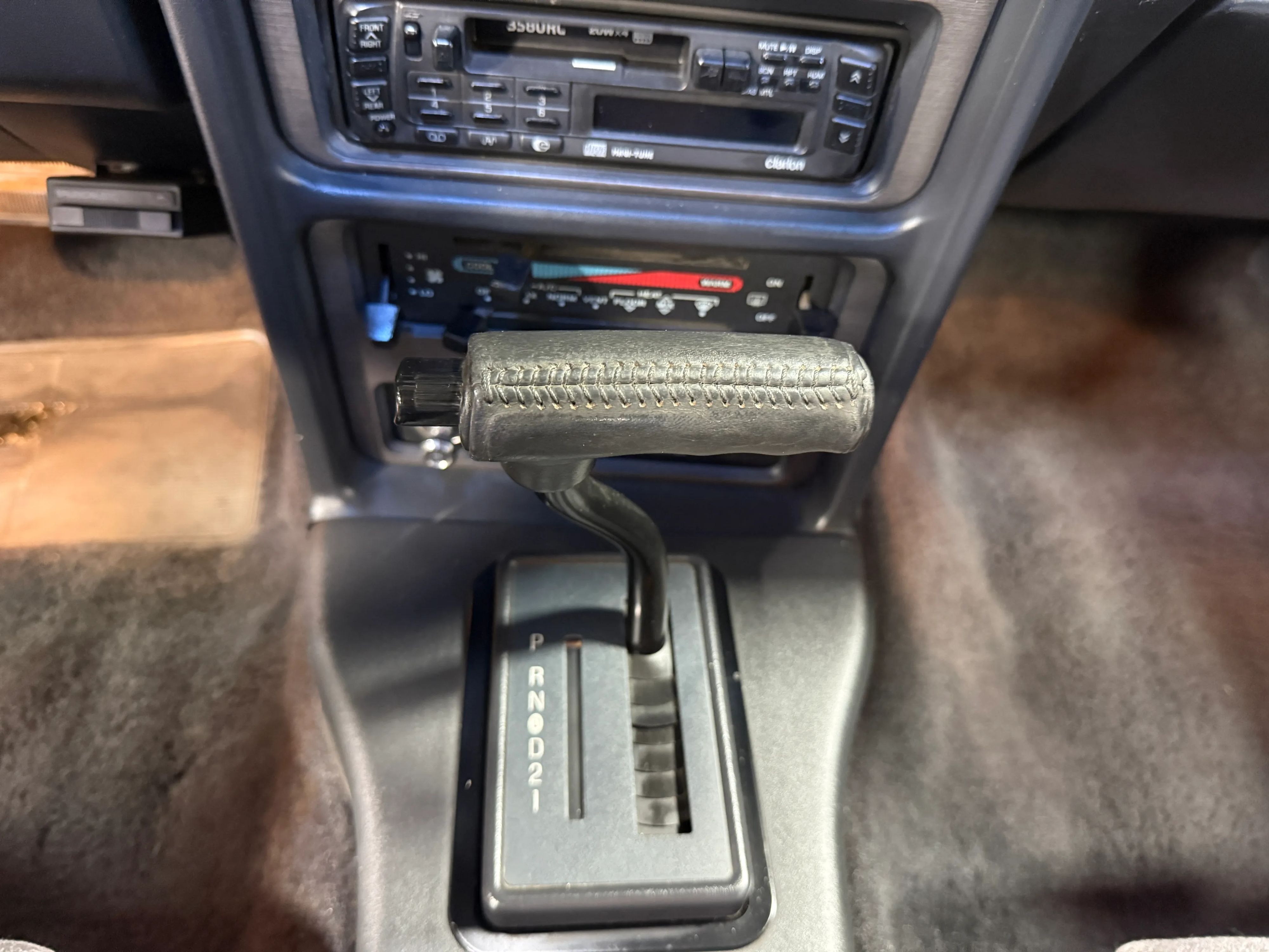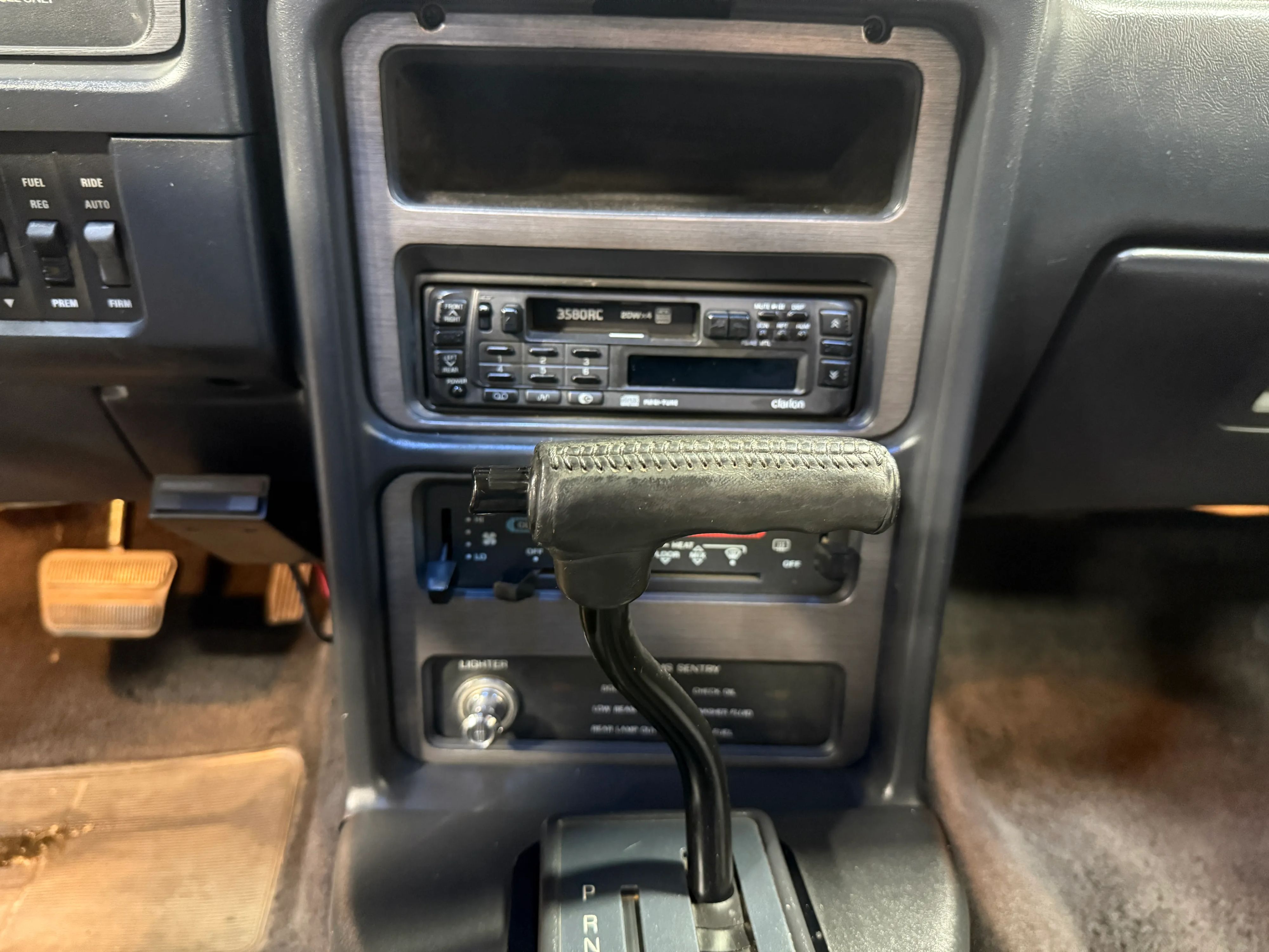 The interior presents in period-correct blue cloth with gray inserts and features power windows, power door locks, cruise control, and Fords premium sound system, enhanced with a Clarion radio head unit. The air conditioning system is intact and blows cool but could benefit from a recharge.