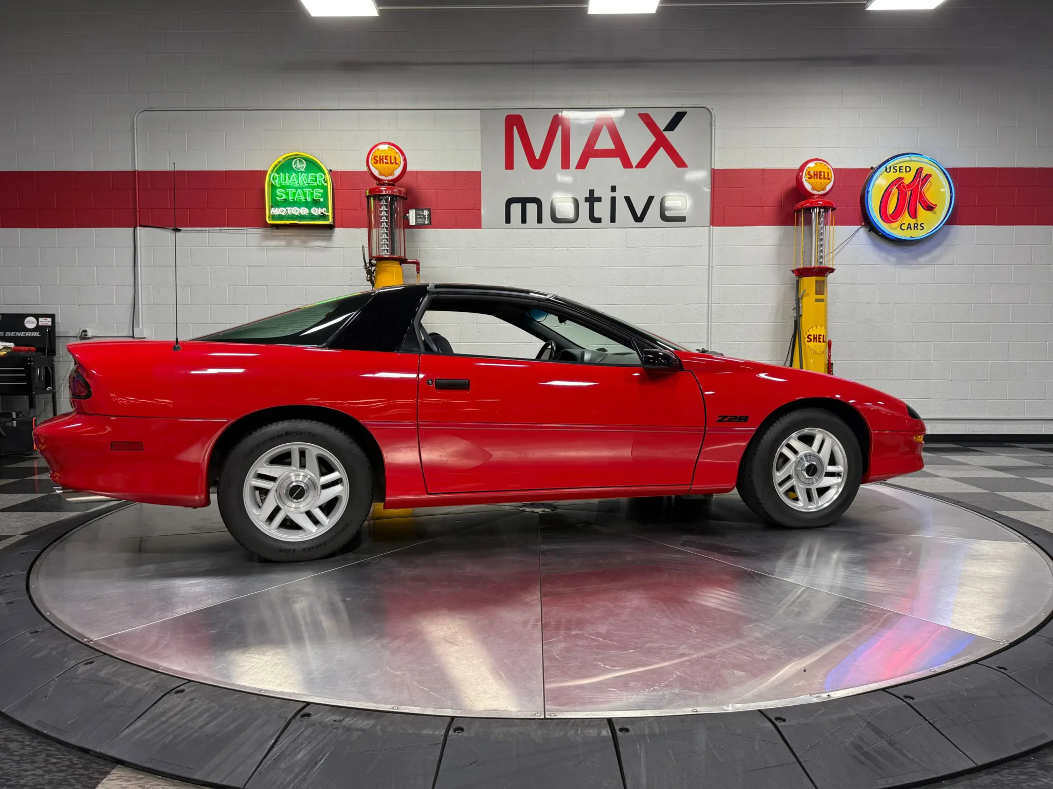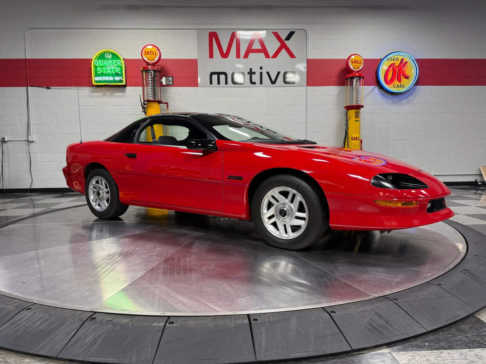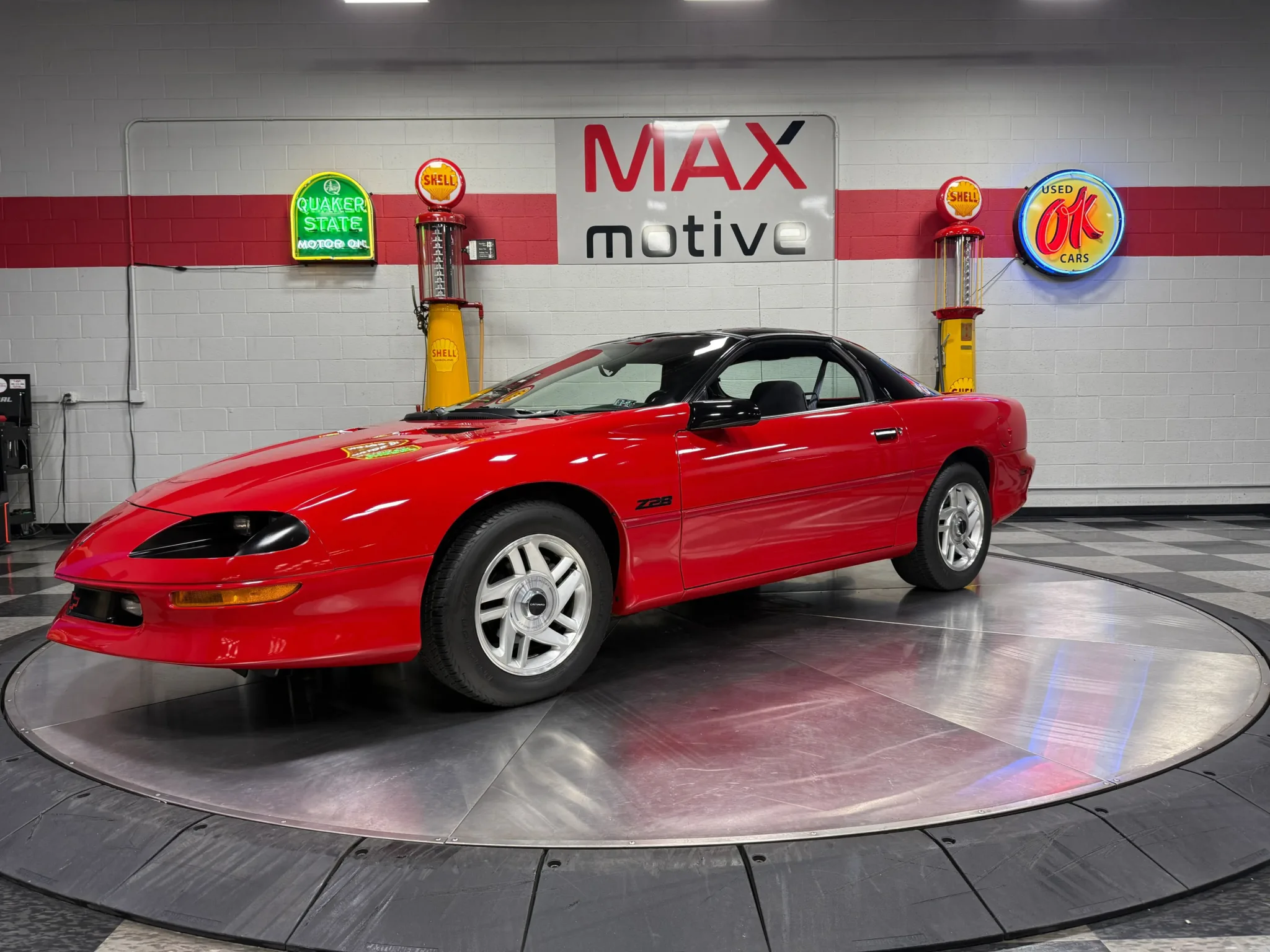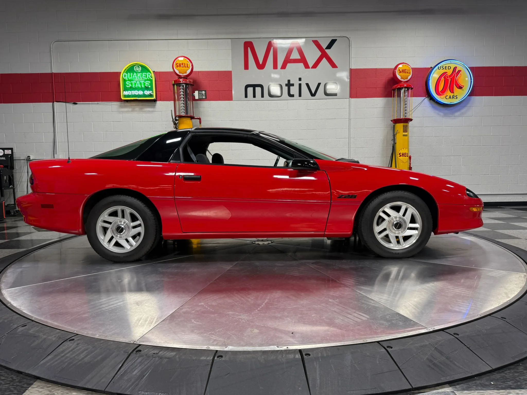 Maxmotive is proud to present this very low mileage 1996 Camaro Z-28. This stunner presents itself very well in its original condition. The current owner has preserved and enjoyed the Camaro for the last 10 years or so, and it is now ready for its next owner and chapter to start. The red paint is still nice and glossy, and the interiors shape shows the level of care and preservation this Camaro has been under. The plastic original upper dash pad is still intact showing how much garage time this Camaro received. This Camaro was equipped from the factory with factory T-Tops, power windows and mirrors, cruise control, and a Bose CD player. The 16 aluminum double spoke rims give the Camaro the appropriate stance, but the LT1 V-8 engine is still fully ready and capable of roasting the rear tires. The factory original window sticker is included as well. The air conditioning compressor spins freely, but the A/C does not blow cold. The passenger window motor can be lazy going up. You can see more pictures and videos at www.maxmotive.com
