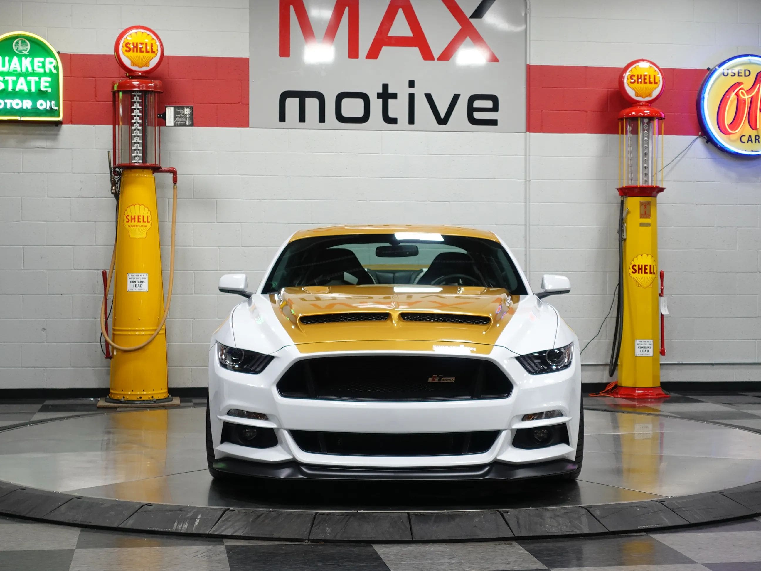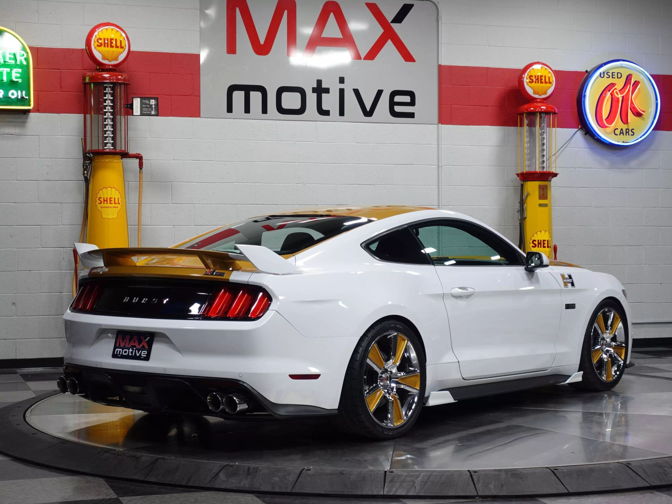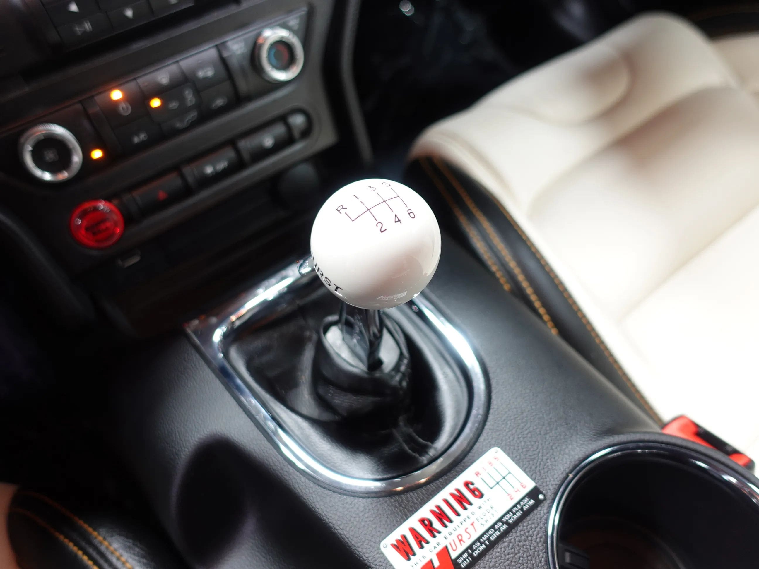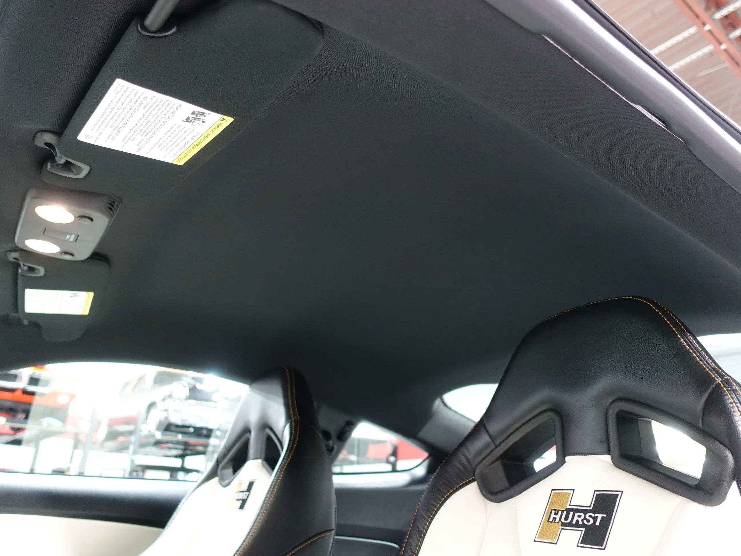 Naturally, there has to be a Hurst shifter, so in classic style a Hurst Competition Plus unit complete with a reverse lock-out and trademark white ball is installed. Hurst components by Flowmaster help the engine breathe with a 3-inch stainless cat-back dual exhaust system with crossover pipe and dual quad 4-inch stainless double wall tips finished with the Hurst logo. Aesthetically, the car is simply stunning with its Oxford White and Hurst Gold color scheme. The gold paint has just the right amount of metallic sparkle to it. Custom Hurst badging and logos are found throughout the car including a serialized dash plaque with the cars unique serial number.