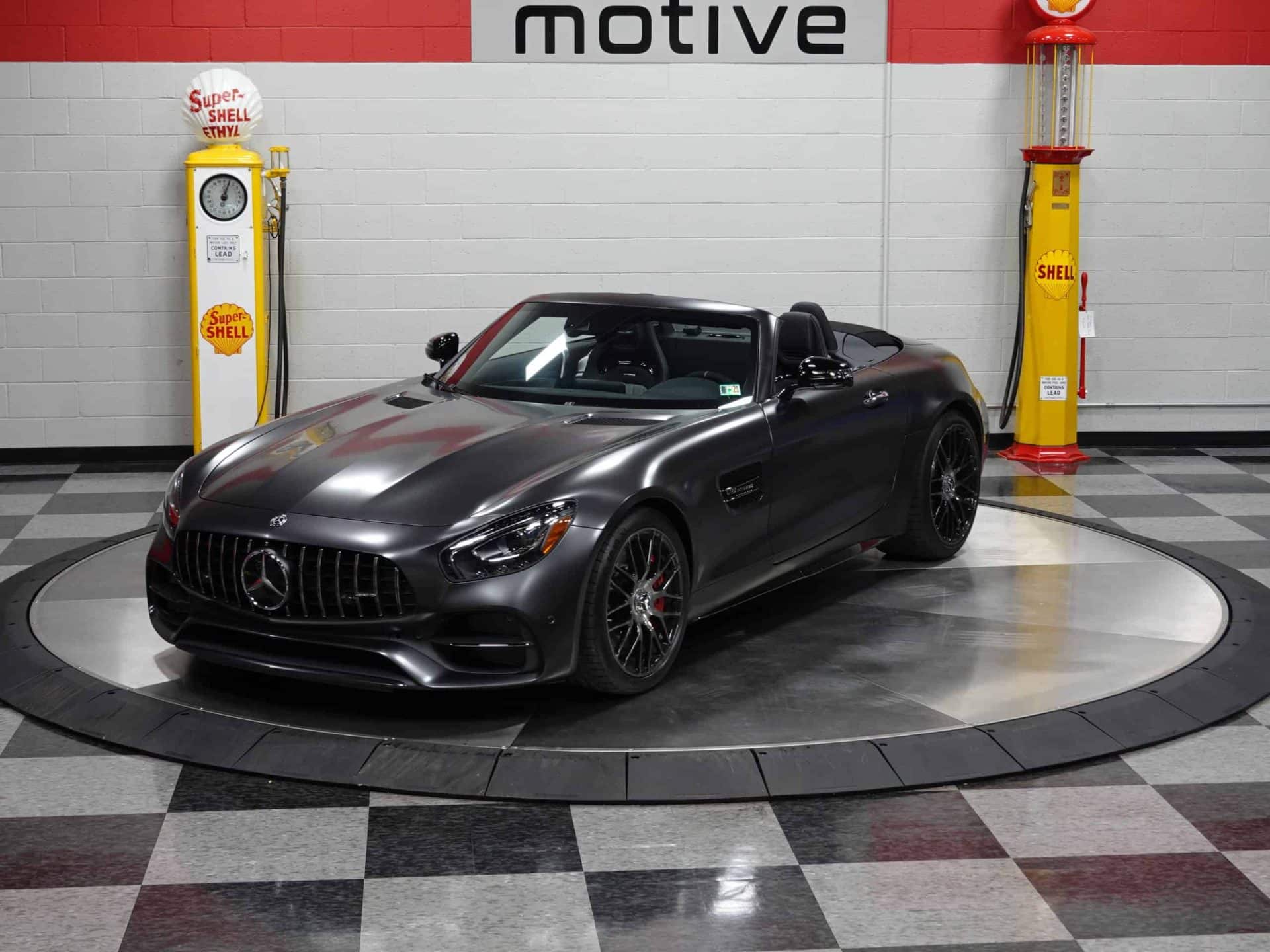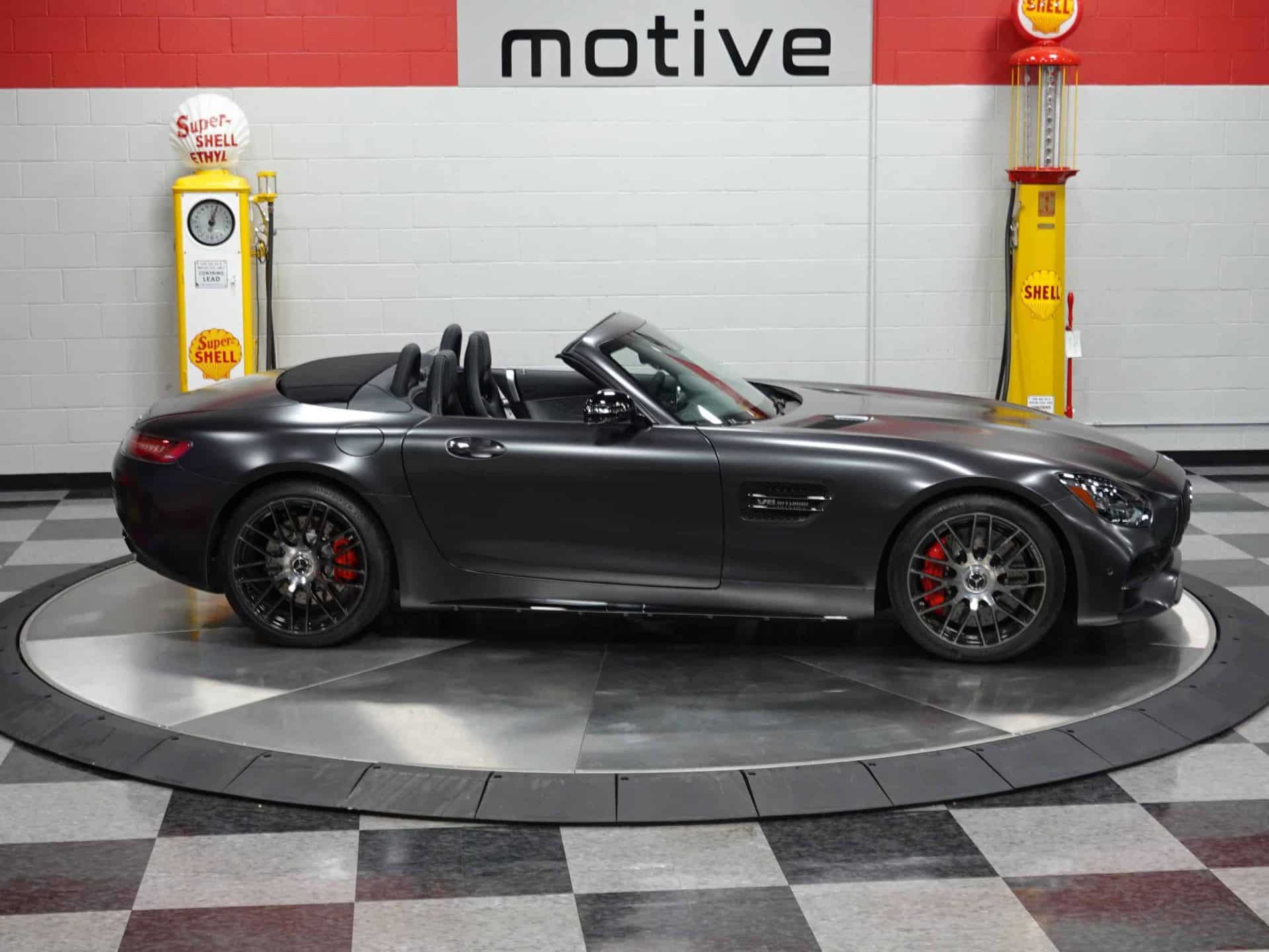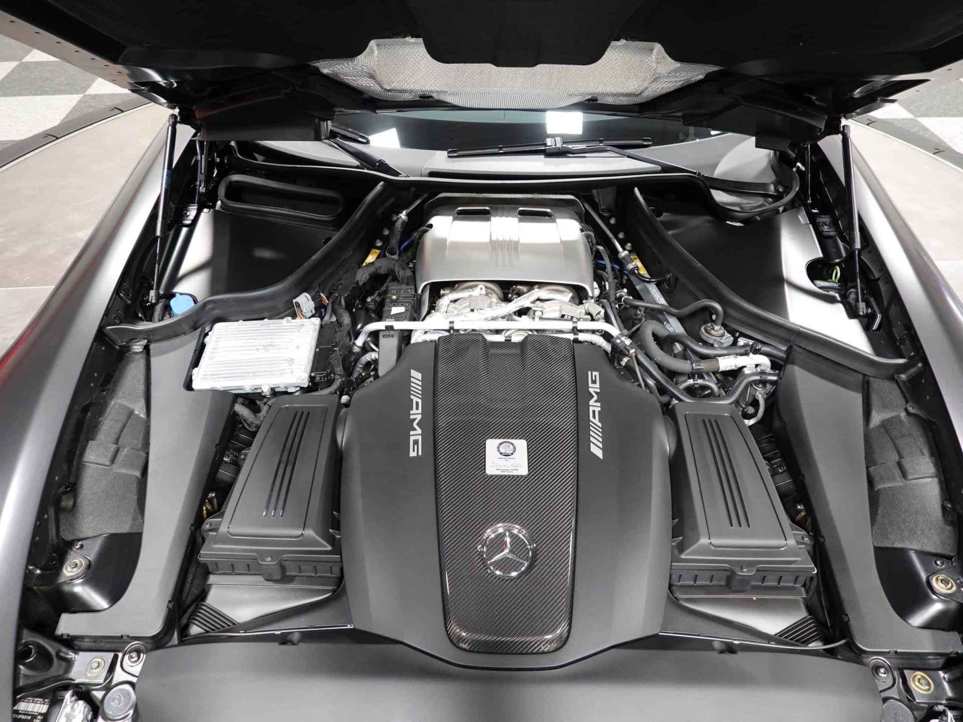 A sight to behold, here is an ultra-exclusive (One of only 50) 2018 Mercedes Benz AMG GT C 50th Anniversary. A mint example with only 552 careful miles, this unique ultra high performance and ultra luxurious Benz offers high-end content and world-class technology. With input from Mercedes Benz’ own Formula 1 World Champion Lewis Hamilton, the company’s AMG racing branch developed the AMG GT entirely in-house. Powered by an authoritative 550 horsepower 4.0L Bi-Turbo V8, it is an extremely engaging automobile with five driving modes. They are Individual (which lets you blend characteristics of the others), Comfort, Sport, Sport +, and Race. You can even adjust the sound of the exhaust. Paddle shifters allow you to operate the AMG Speedshift 7-speed Dual Clutch Automatic Transmission manually. The AMG GT C is a world-class sports car in its own right, but to celebrate the 50th Anniversary of AMG, 50 of these special editions were offered. The 50th Anniversary Edition adds the matte Designo Graphite Gray Magno exterior finish; forged gloss black cross-spoke AMG wheels; black chrome front splitter, fender vent fins, and side skirt inserts; plus black chrome rear diffuser trim and black chrome exhaust outlets. The interior gets silver pearl and black Nappa leather diamond-stitched upholstery, AMG black chrome interior trim, an AMG full Dinamica suede-covered steering wheel (and roof liner), and AMG Edition 50 badging. Burmester High End sound fills the cabin, Mercedes’ optional Parktronic system aids with parking, and the Distronic option is an autonomous cruise-control system. There are many delightful features not found on many cars. The top of the steering wheel is marked just like a Formula 1 car and it’s connected to an electrohydraulic steering rack. The engine and transaxle mounts are electronically controlled to provide an optimum blend of comfort and precision. And there’s a “Handcrafted” badge on the engine cover with the personal signature of the AMG technician who assembled the engine.
