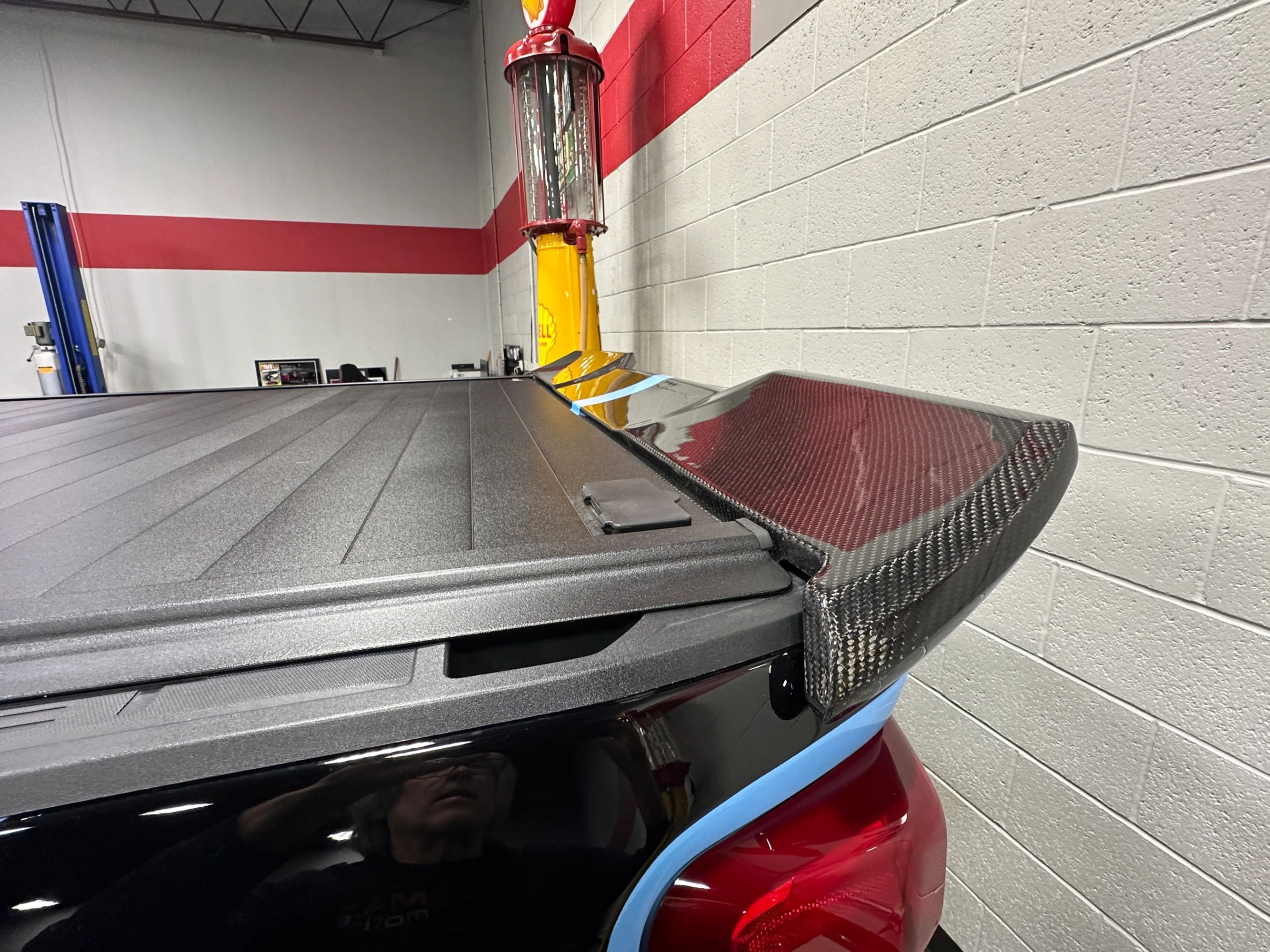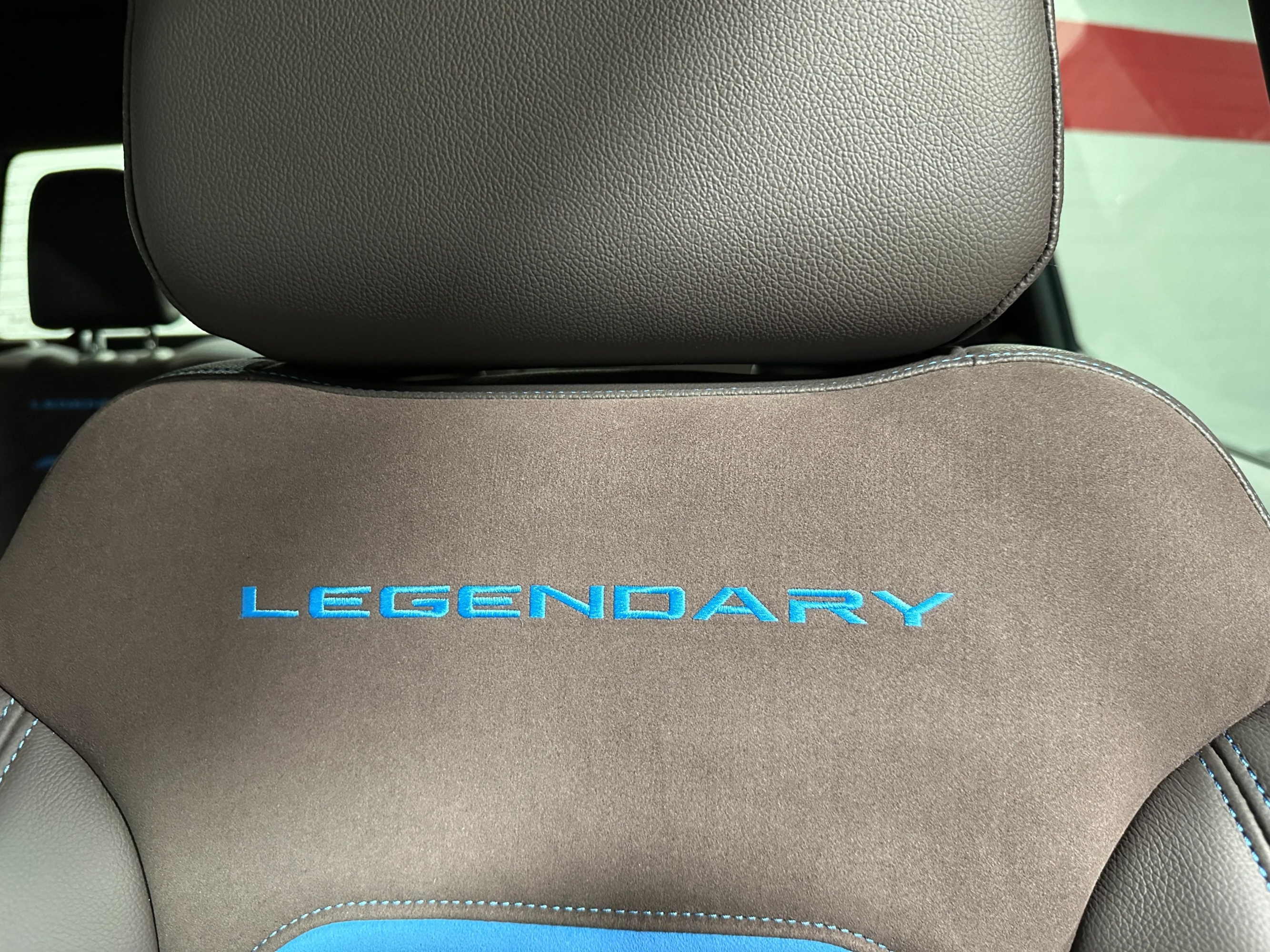 A custom widebody conversion allows the accommodation of huge purpose-built 285/45R22 and 325/40R22 Continental PremiumContact 6 ultra performance tires even with the lowered stance offered by the IHC custom suspension. These tires are mounted on specialty wheels built by Legendary in collaboration with Superior Industries. Behind the spokes, the Brembo Monoblock 8-piston calipers and drilled 16.2 inch rotors are visible. The trucks appearance is further distinguished with a forged carbon fiber air management package, which includes a carbon fiber front splitter, side skirts, roll pan with integrated rear diffuser, and rear spoiler. Passenger accommodations are simply luxurious with alcantara and leather seating surfaces, heated and cooled seats, and limousine-like back seat roominess. Custom embroidery and carbon fiber trim accentuate the upscale feel of the cabin.