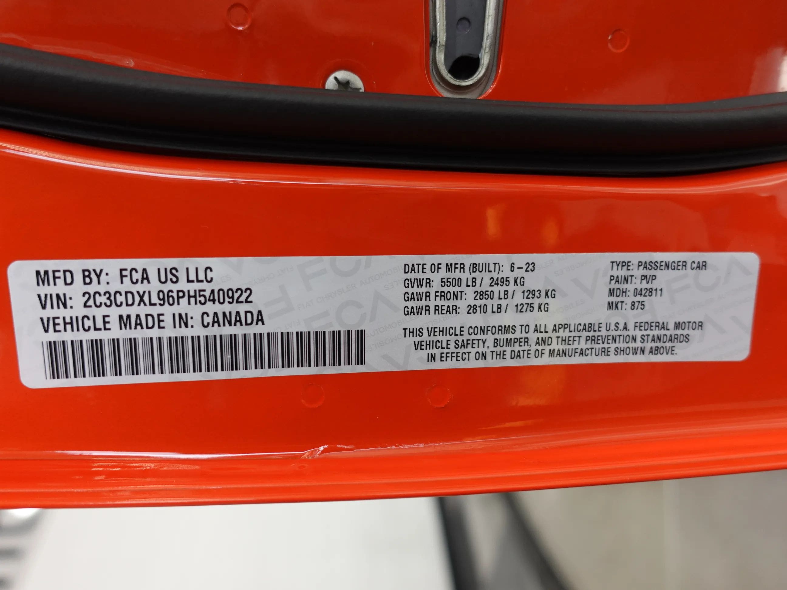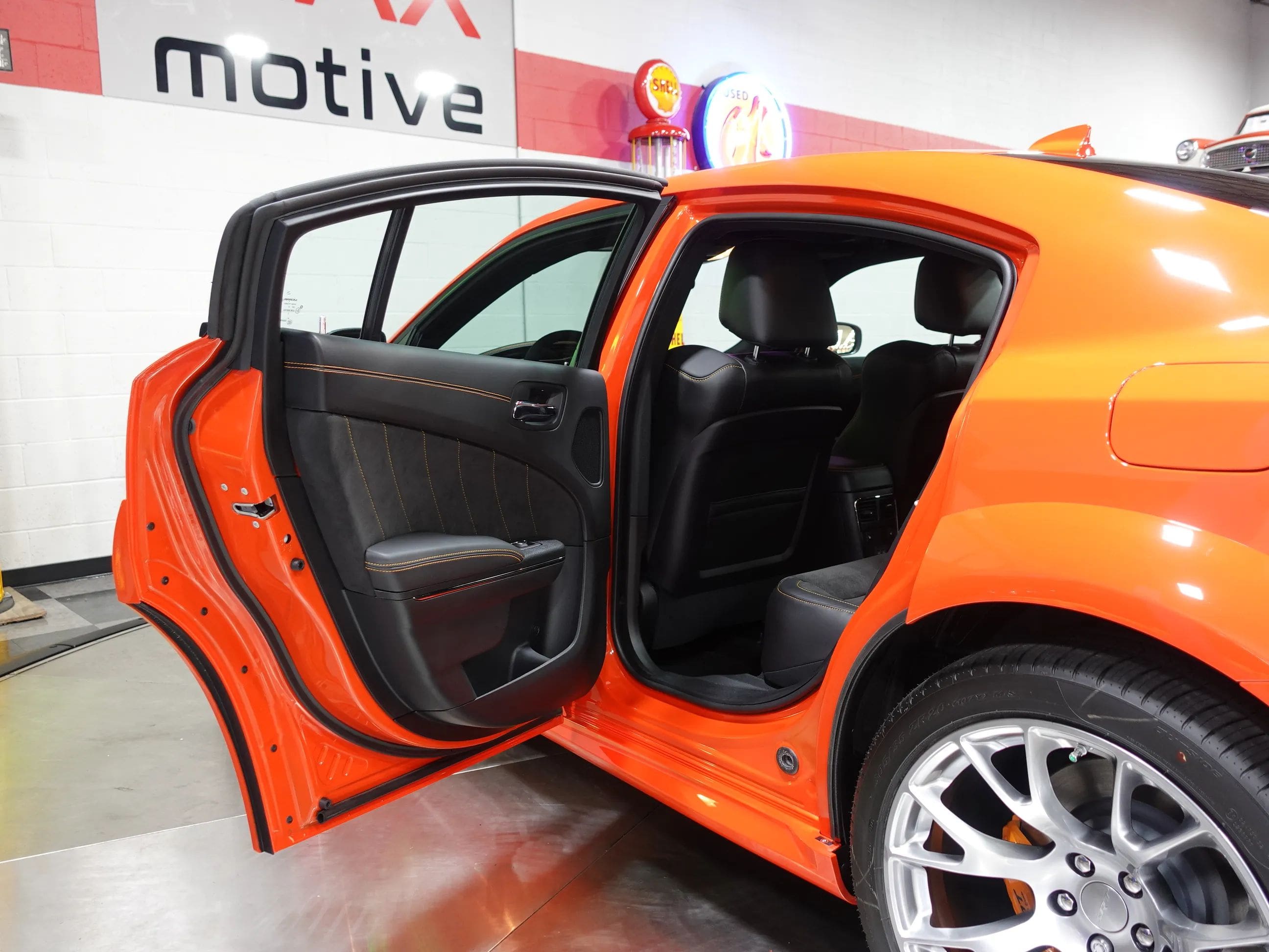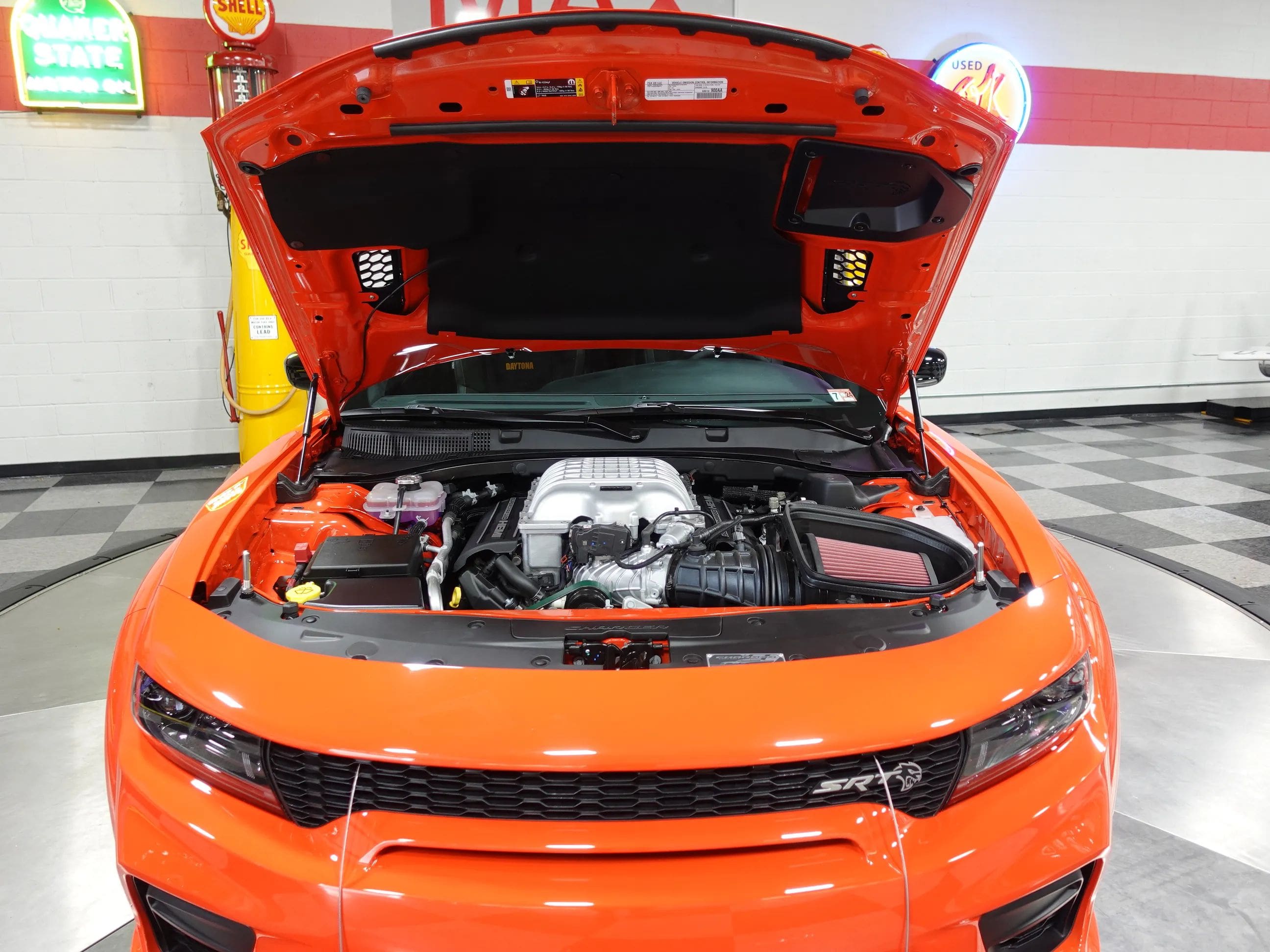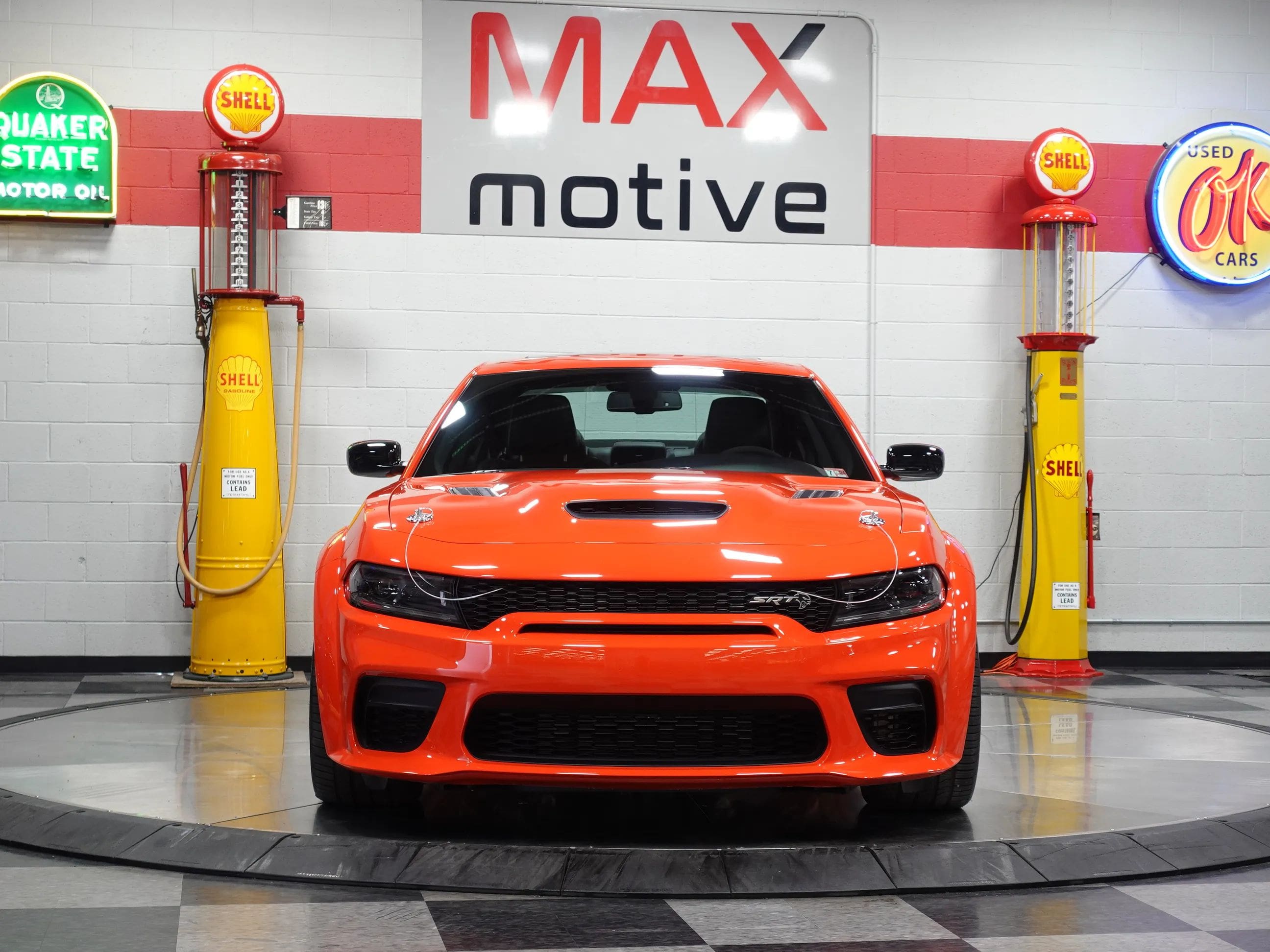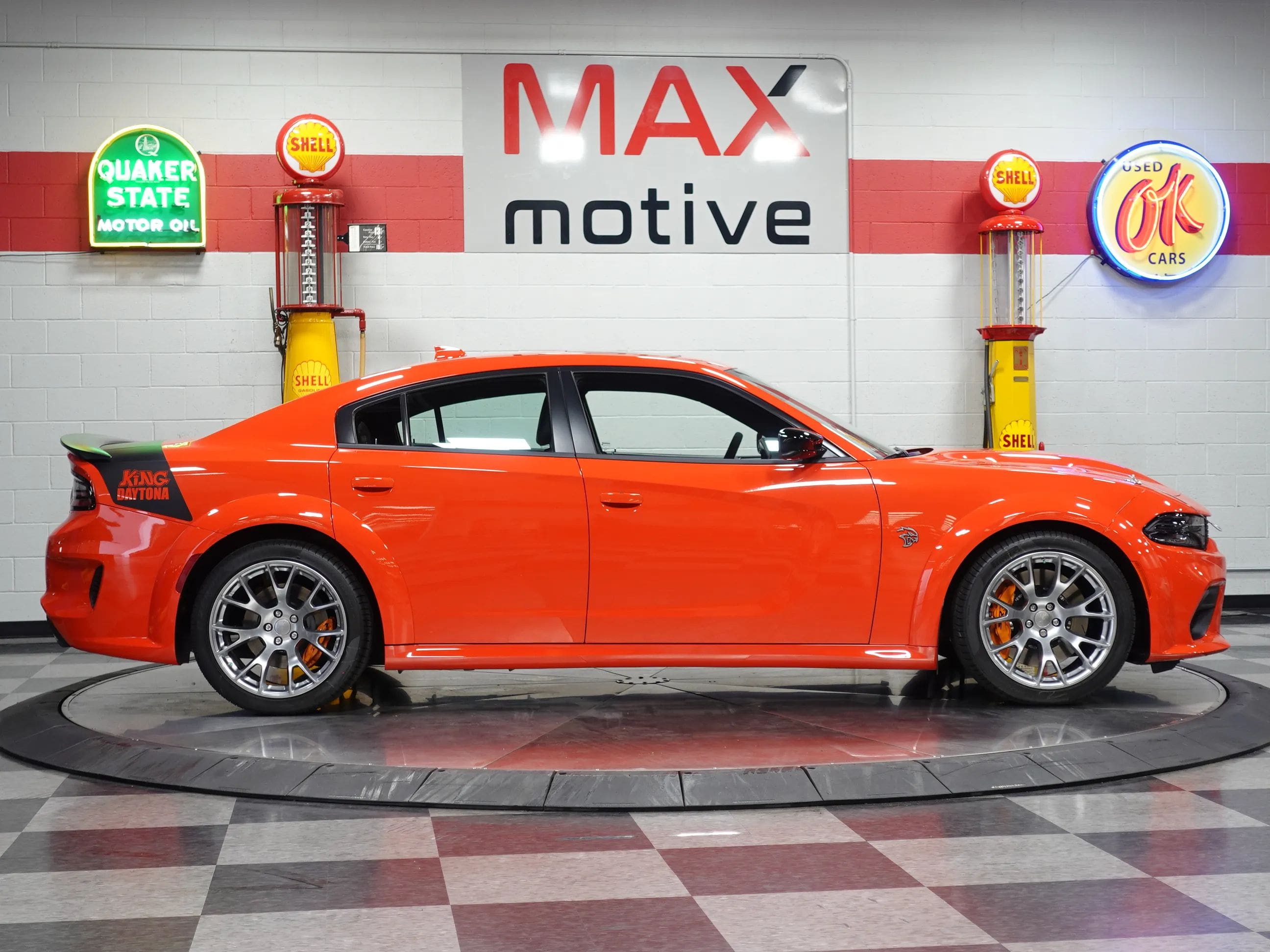The first supercharged car of the long-anticipated Last Call Editions, this 2023 Dodge Charger King Daytona Special Edition is now available from the MaxMotive Pittsburgh Showroom. The King Daytona is an SRT Hellcat Redeye Widebody with special content, not the least of which is 10 extra horsepower, bringing the total to a brutal 807! Just 300 King Daytonas were built; this one comes with the original window sticker, build sheets, and Factory Shipping Order. The 6.2L Supercharged HO V8 engine works in conjunction with the 8-speed automatic HP90 transmission, after-run chiller, Line Lock Launch Control, Launch Assist, and SRT Configurable Drive Modes to provide adrenaline-rush performance with amazingly smooth, luxurious driveability. The King Daytona is distinguished by its Go Mango exterior paint, King Daytona trunk stripe, orange Brembo brake calipers, front and rear SRT spoilers, and 20x11 Warp-Speed Satin Carbon Wheels. Inside, its appointed with plush Nappa/Alcantara seats with logos, suede door trim, suede headliner, orange interior accent stitch, real carbon fiber interior accents, and an SRT Alcantara Steering Wheel. This example also features the Navigation Group, the Harman/Kardon Audio Group (900 watts and 19 speakers) and a Power Sunroof.